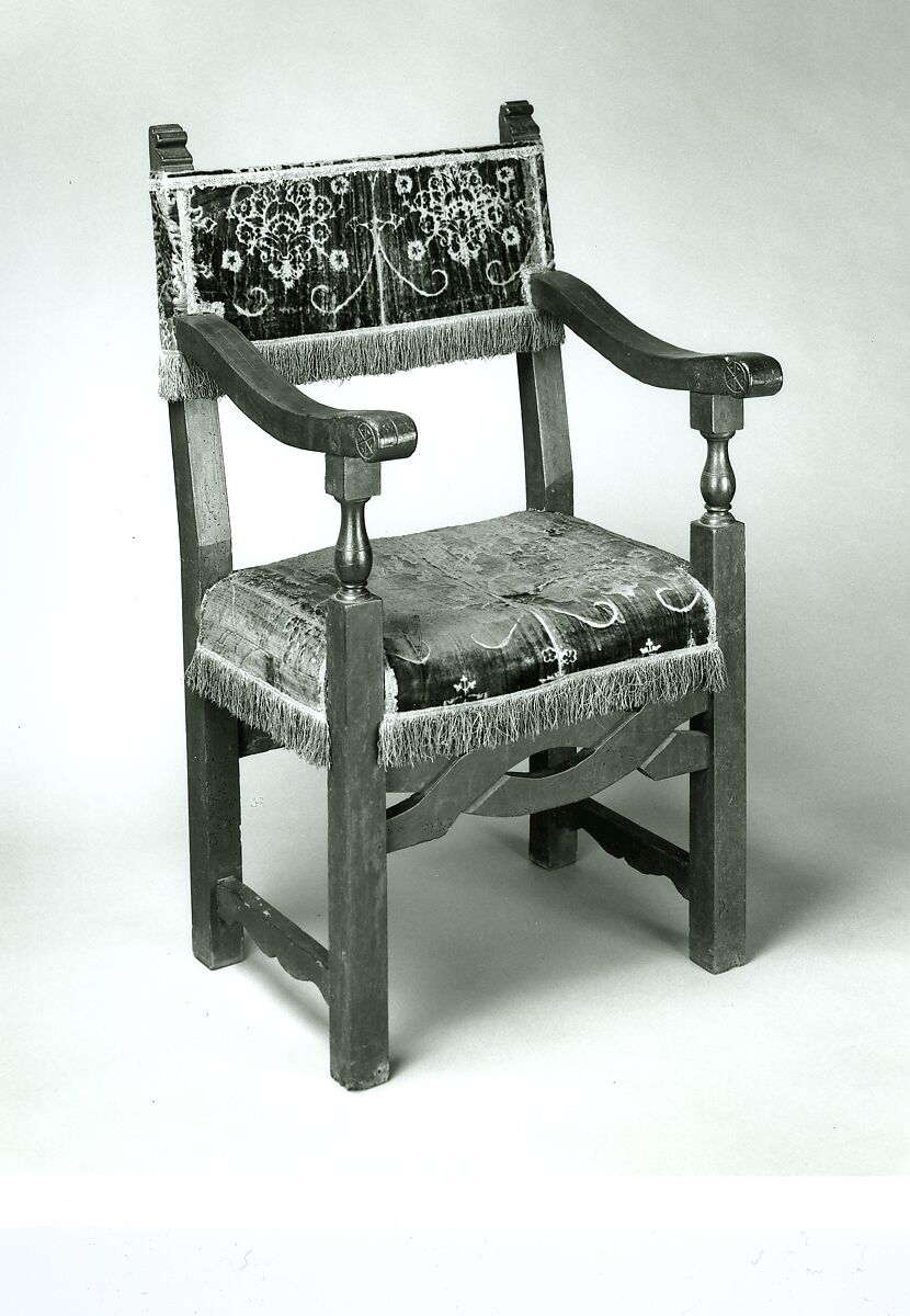 - Medium: Walnut, carved and turned; silk cut-velvet braided tape with fringe of green silk and gilt-metal thread.