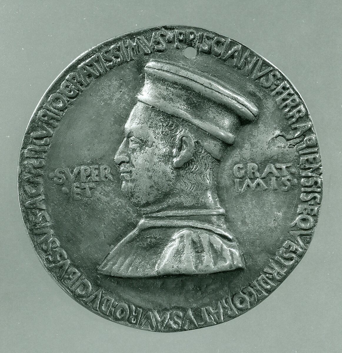 Sperandio di Bartolommeo Savelli was an Italian medallist, architect, sculptor, painter, bronze and cannon caster. He was the son of a Roman goldsmith, Bartolommeo di Sperandio Savelli. Sperandio is first mentioned as a goldsmith at Ferrara in 1445 and again in 1447. He appears to have returned to Mantua at some point and to have been employed by Borso d'Este, Marquess of Ferrara, by the early 1460s. On the obverse is a portrait of Pellegrino Prisciani (ca. 1435 – 1518), and on the reverse Prisciani is shown