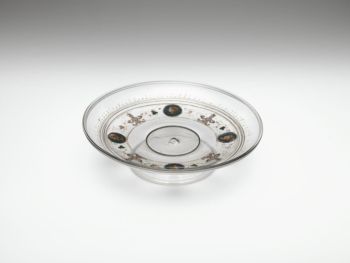 - Medium: Colorless (slightly gray) nonlead glass. Blown, reverse painted, gilt (unfired).