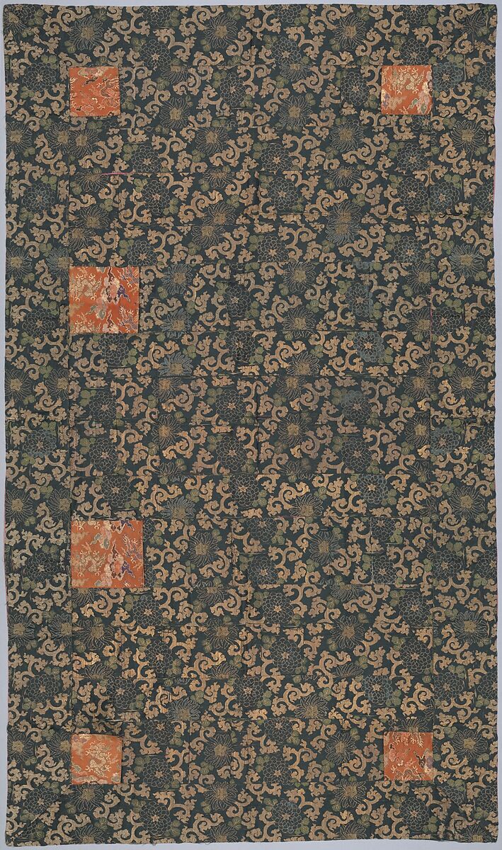 - Medium: Silk, gold leaf on lacquered paper strip, and gold leaf on lacquered paper-strip-wrapped cotton, warp-float-faced 4/1 satin weave with weft-float-faced 1/2 "z" twill interlacings of secondary binding warps and supplementary patterning wefts.