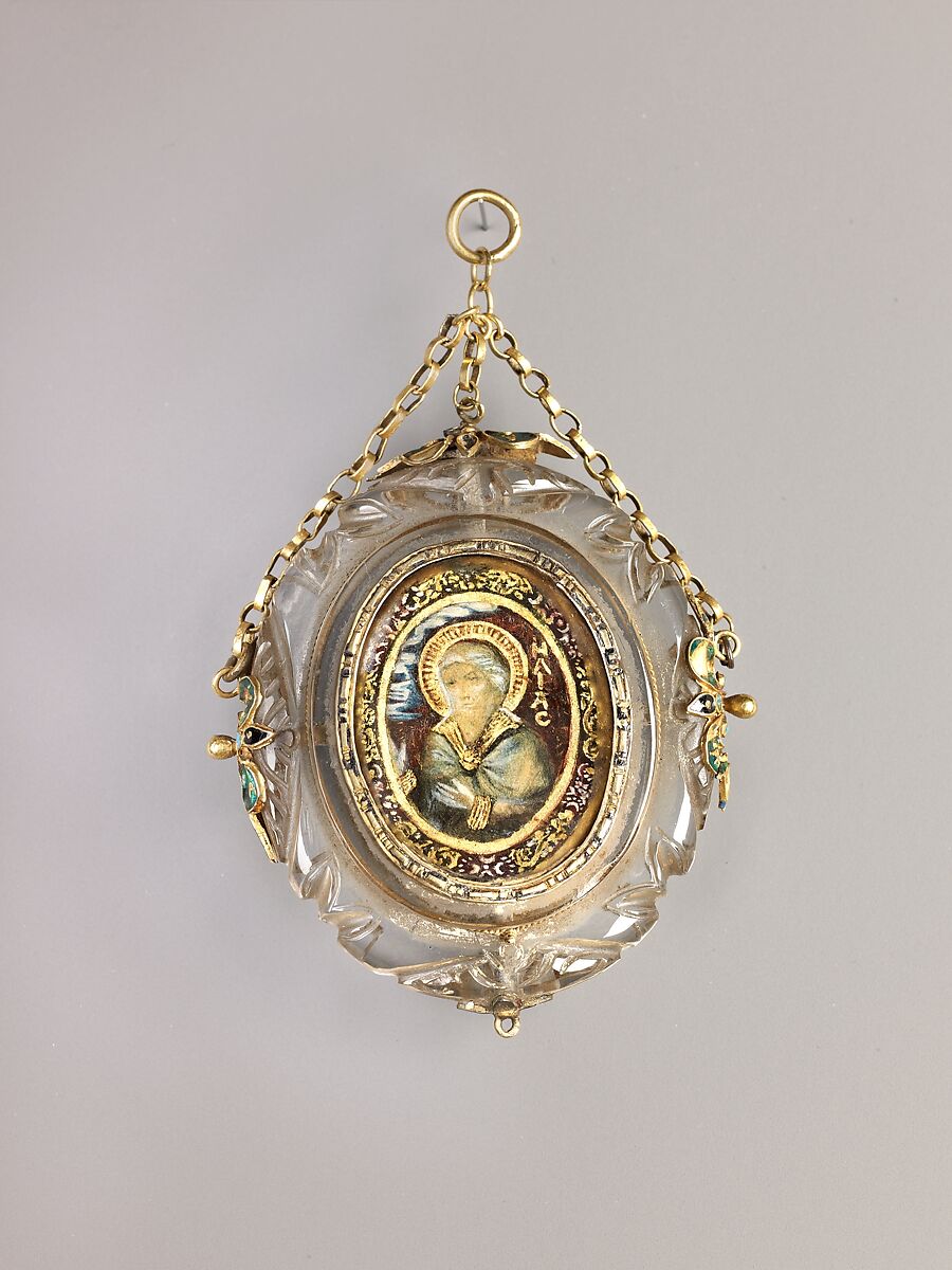 - Medium: Cut and polished, reverse-painted, reverse-gilt, and reverse-silvered rock crystal; gold wire; gold; enamel; Assembled.