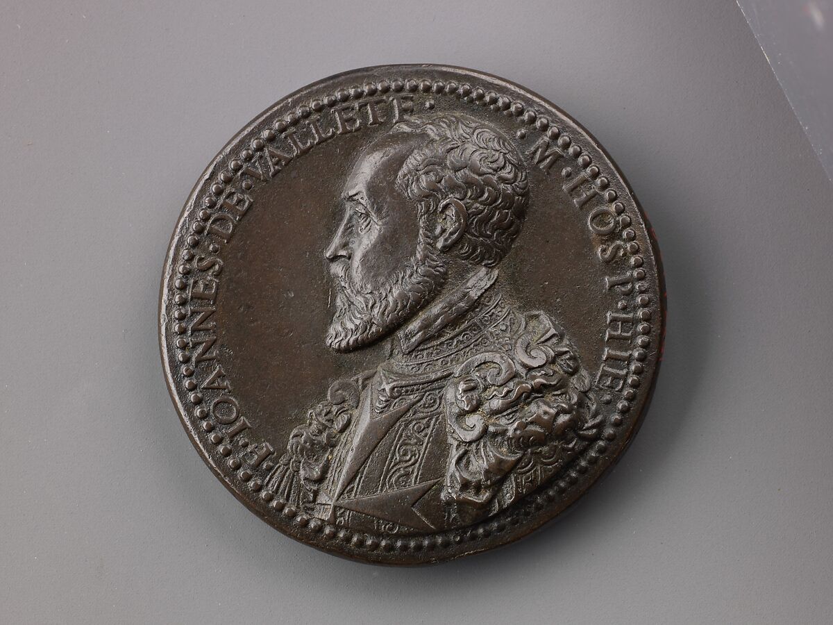 The obverse bears a portrait of Jean Parisot de la Vallette (1494 – 1568), Grand Master of the Order of Saint John at Malta (1557 – 68). On the reverse is a fleet of galleys attacking an elephant with a female rider, and a fortified town, possibly La Valletta, in the background. Jean de la Vallette was the founder of the Maltese capital of La Valletta, which was named after him. The medal commemorates the building of the fortified city as an important stronghold against the Turks. The elephant either represents Africa, welcoming the knights of Saint John, or the Turkish invasion from the sea.