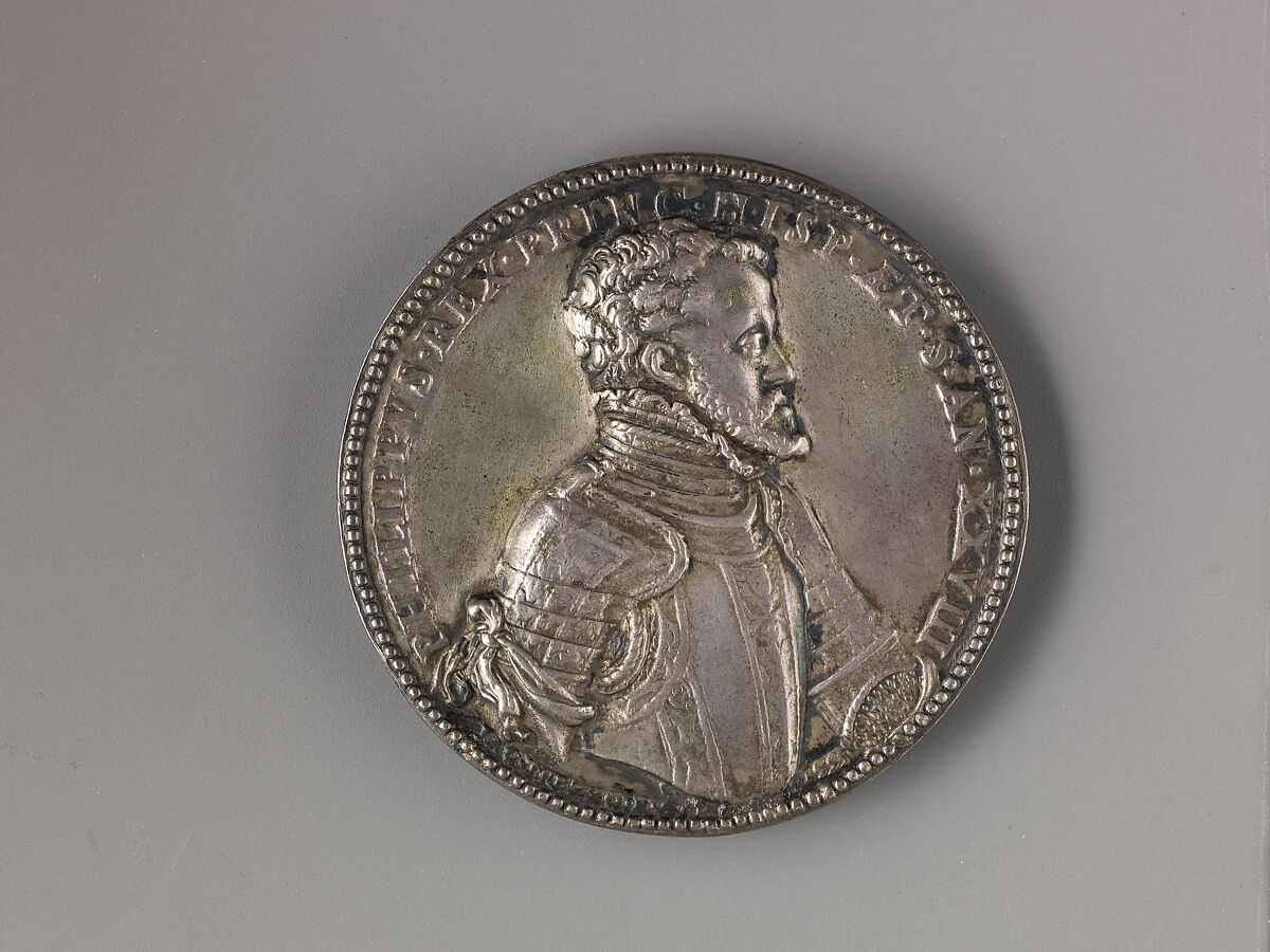 The obverse bears a portrait of Philip II, the son of the Holy Roman emperor Charles V and Isabella of Portugal. He ruled over an expansive empire encompassing Spain and all its dominions in the New World, as well as the Netherlands, Naples, and Sicily. Philip served as king consort of England during his brief marriage to the Queen of England, Mary Tudor (1516 – 1558), whose image appears on the medal's reverse. The medal is an unusual combination and recast of