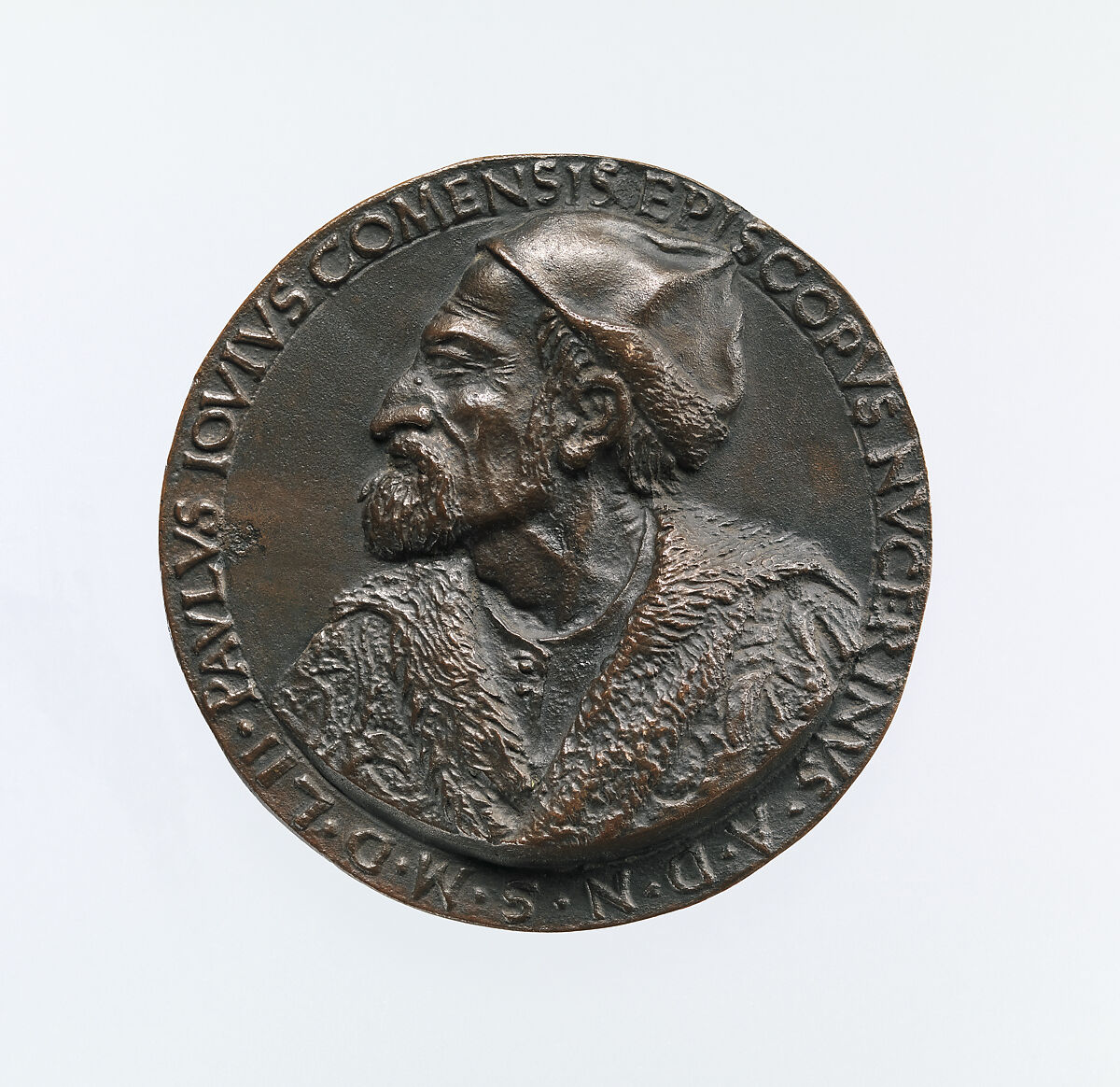 The medals' obverse portrays the writer, historian, and collector Paolo Giovio, known for the group of portraits of famous men that he assembled in his villa near Lake Como as well as his writing on contemporary history, including the lives of illustrious men.