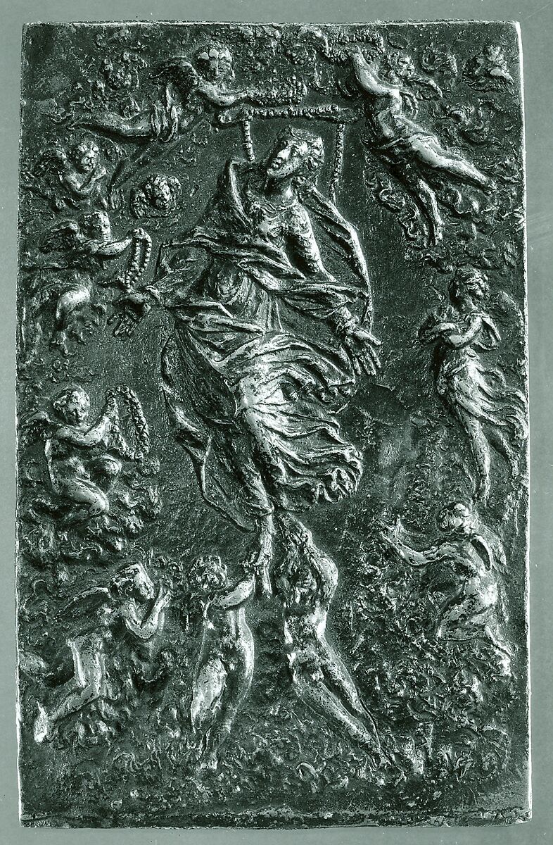 This plaquette depicting the Assumption of the Virgin is attributed to a follower of the sculptor and architect Jacopo Sansovino. A comparable plaquette was formerly in the Gutekunst collection in Stuttgart. The Lehman work is a thick and heavy cast.