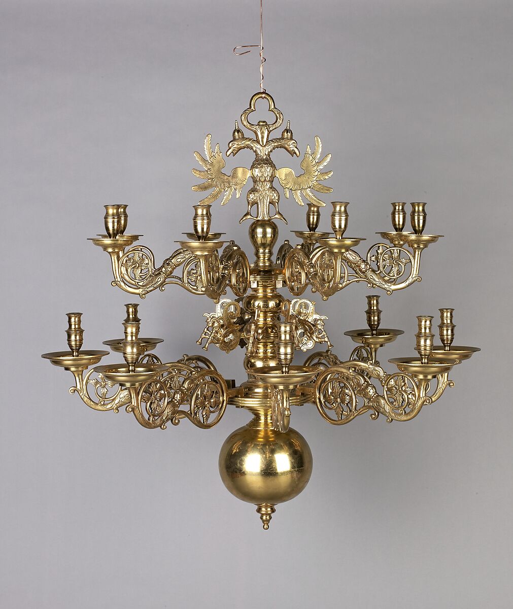 The chandelier has two series of eight S-shaped branches around a baluster shaft resting on a massive globe and with a finial shaped as a double-headed eagle. It is a coarse cast and overly elaborated model.