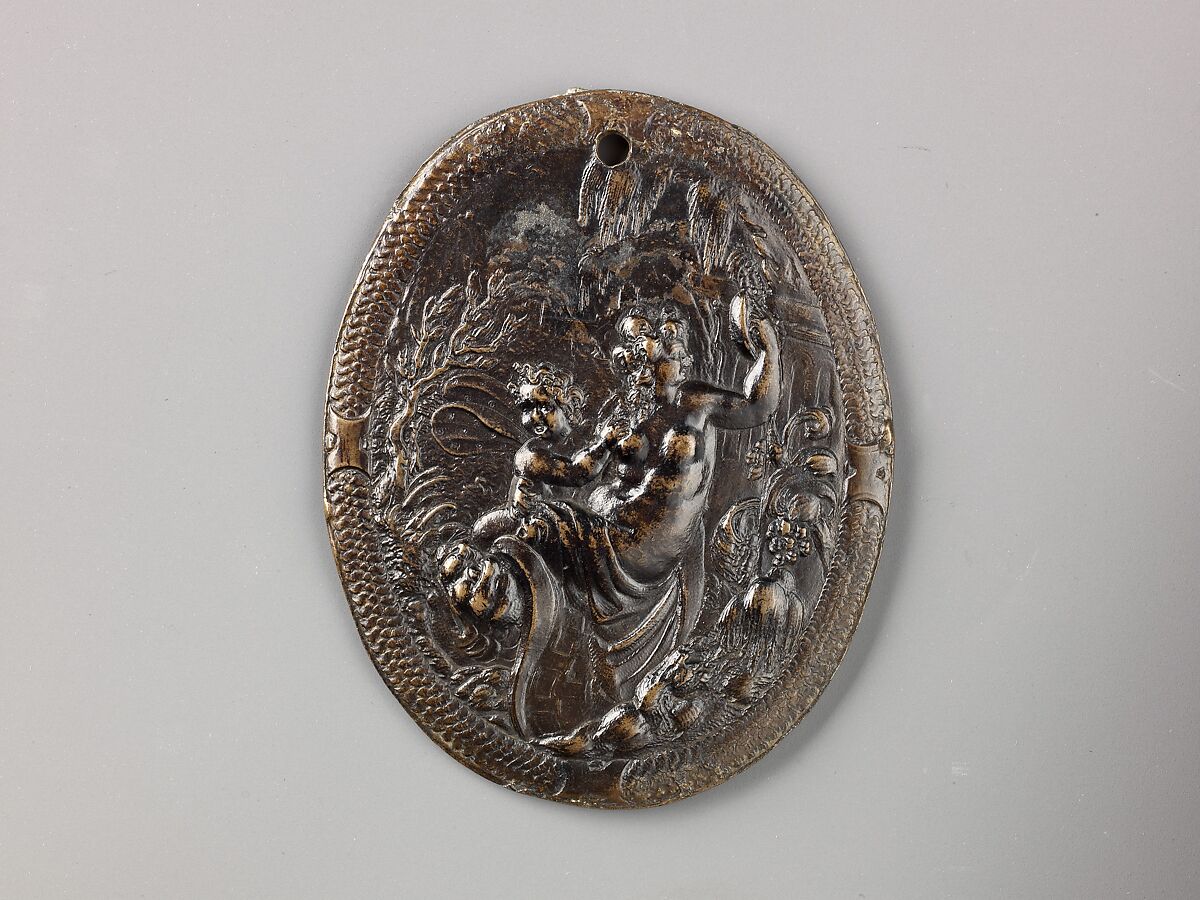 This plaquette depicts Venus and Cupid in a landscape, set in an oval, stylized wreath. While Paul Hübner has been identified as the possible author of this piece, it has also been attributed to an anonymous South German artist, possibly from Augsburg and dating from the late sixteenth century. Other versions are in Florence (Museo Stefano Bardini), Lyon (Musée des Beaux-Arts), Munich (Bayerisches Nationalmuseum), and Paris (Musée du Louvre). This object is an early, possibly seventeenth-century, aftercast.