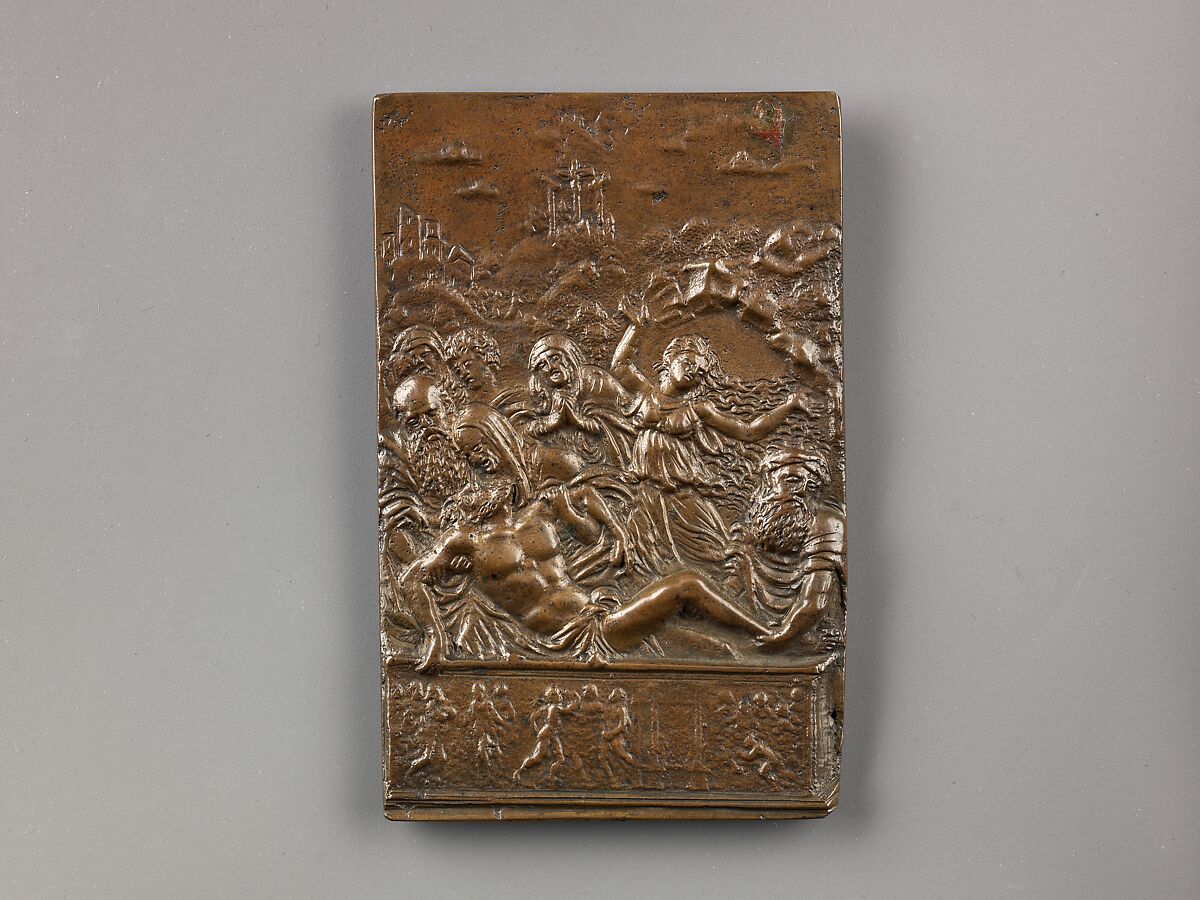 The composition, in particular the body of Christ, is derived from a gilt-bronze Entombment relief from Mantua, possibly after a design by Andrea Mantegna. This piece is an old aftercast with considerable loss of detail, possibly from the seventeenth century.