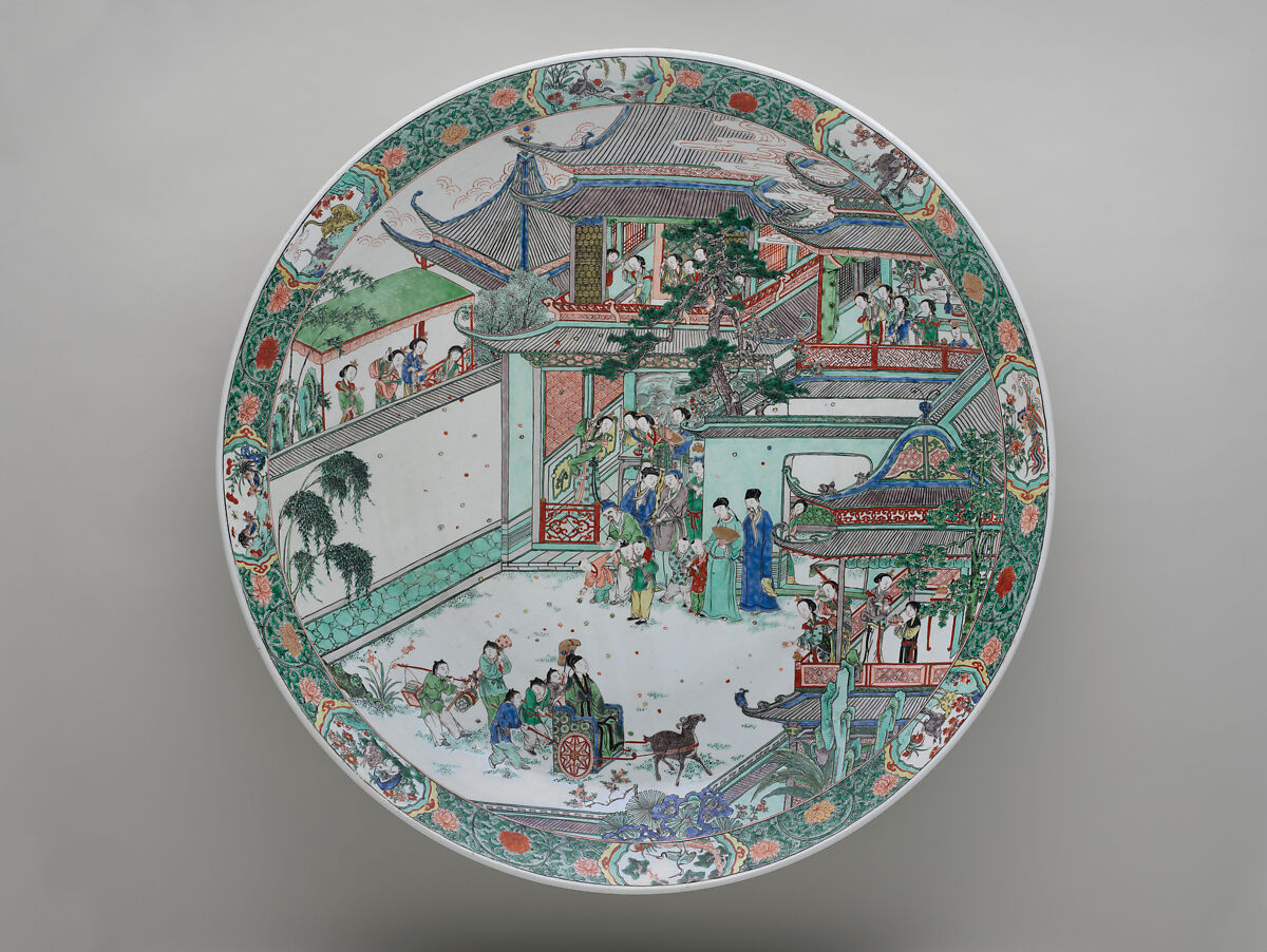 This large platter exemplifies typical wucai (five-color) ware from the Kangxi period, a golden age of enameled porcelain. The era saw the developed of unprecedented fresh hues and rich varieties of enamel, including the recently invented overglaze blue. The platter most likely depicts the talented writer Pan An (247–300) being showered with fruit. Unusually, the cart pulled by a goat refers to another handsome young man Wei Jie (286–312), even though he is not associated with fruit. The ceramic artist freely combined the tales into a composite scene.