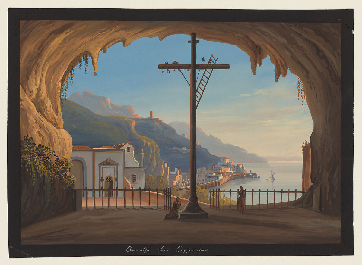 In the late sixteenth century monks of the Capuchin order founded a monastery-hermitage near a grotto in the rocky outcroppings overlooking the small fishing village of Amalfi. As today, Amalfi had been a destination for vacationers since Roman times, and the picturesque monastery there attracted both tourists and religious pilgrims. In the early nineteenth century, views from the grotto were a staple in the repertoire of popular artists of the region.