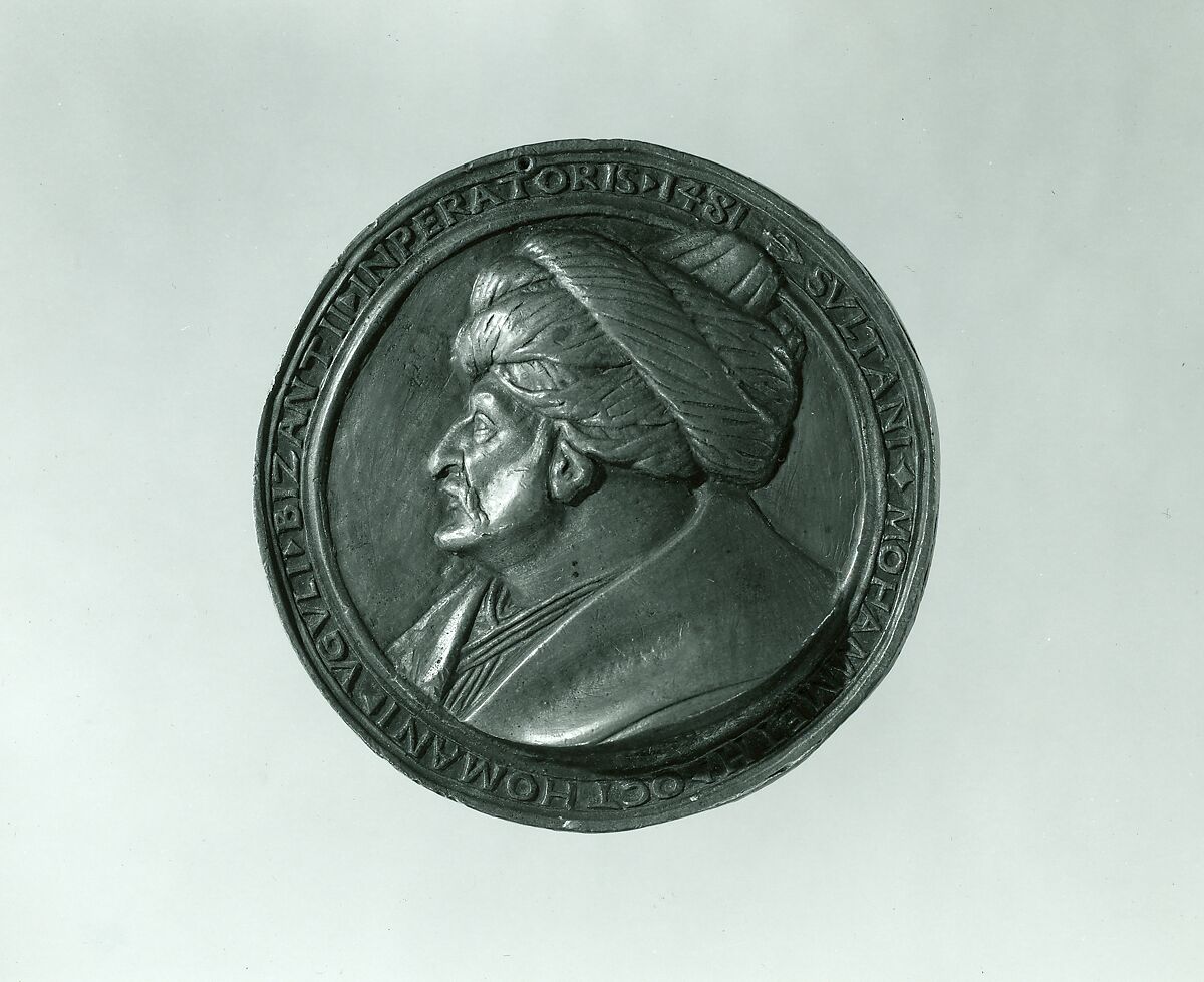 Costanzo da Ferrara was both a painter and a medalist who was primarily active in Naples. Costanzo was called to Istanbul to paint a portrait of the Sultan Mehmed II of Turkey (1430–1481) probably between 1475–1478 when diplomatic relations were restored following the Turkish attack on Negroponte. It is likely that Costanzo remained at the court until the Sultan's death in 1481, when this medal was produced. The reverse shows the subject on horseack. The work is a fine old aftercast of the 1481 version of Costanzo’s original medal of 1477– 80; it was possibly cast after a reworked and polished lead original. Note the unusual spelling of ETERETIE, which should be ET GRETIE.