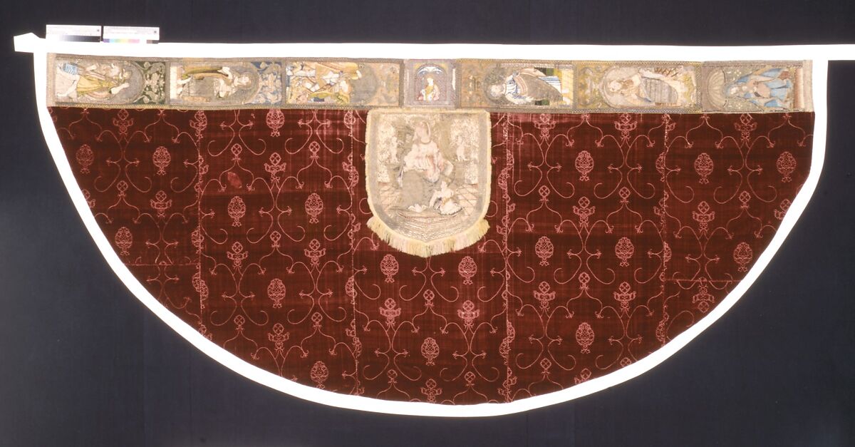 Hood-linen plain weave appliquéd with linen plain weave and embroidered with silk and gilt-metal-strip-wrapped silk - Dimensions: Center back neck to hem: 47 1/2 x 163 1/2 in. (hem circumference) (120.6 x 415.3 cm)