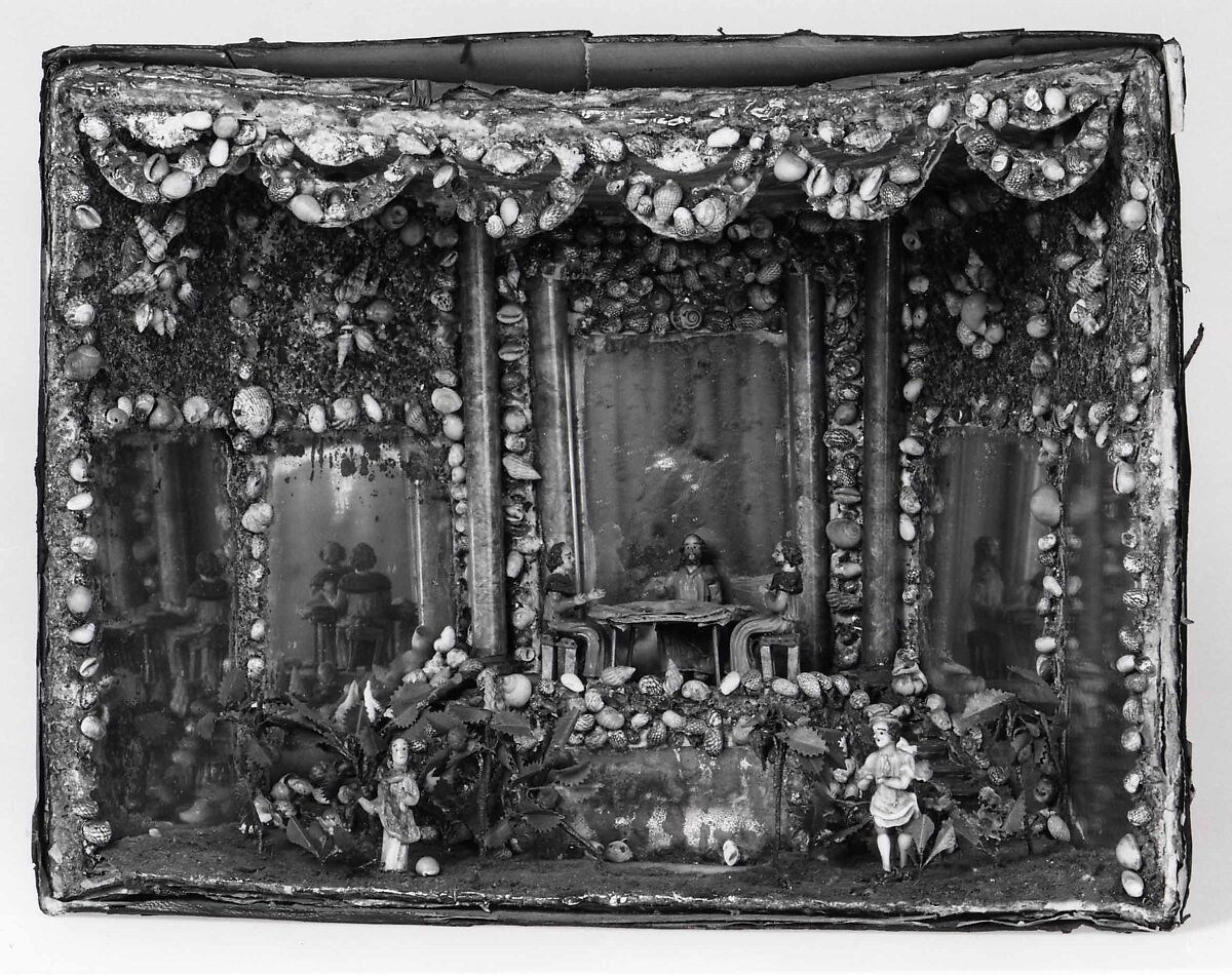 - Medium: Figures and flowers of lampworked glass (opaque white, pink, lavender, green, brown, purple, black, blue, light blue, and colorless), cardboard, paper, shells, glass mirror plate, glass chips, imitation leather (paper), cloth, paint, composition material, wire, fabric. Assembled.