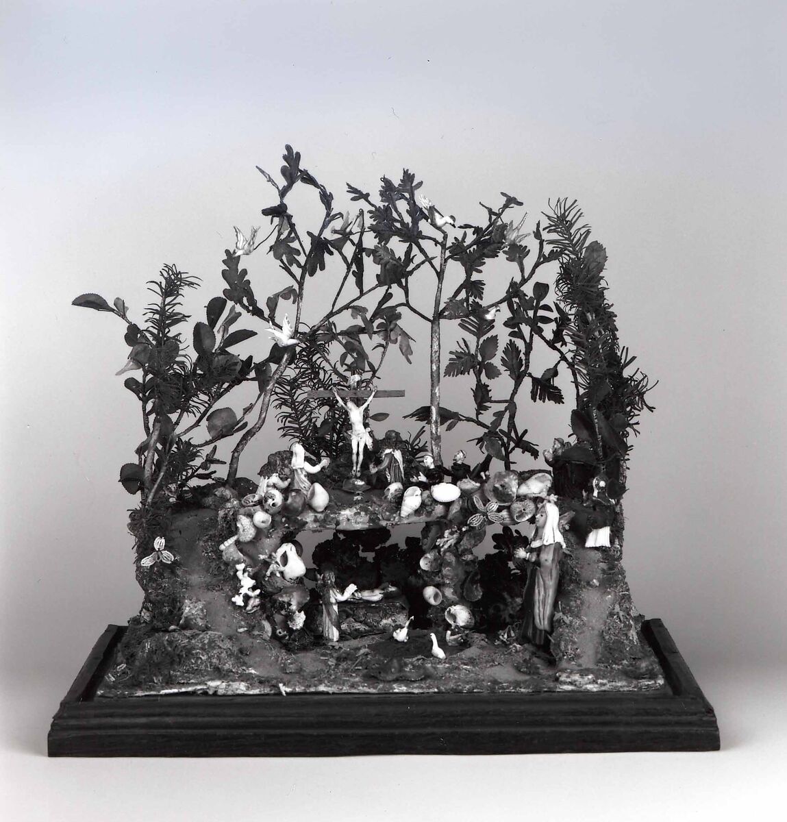 - Medium: Figures of lampworked glass (opaque white, black, red, yellow, brown, pink, green, light green, blue, bright blue, light blue, gold aventurine, and colorless), cardboard, papier-mâché, glass mirror plate, glass seed beads, shells, paper, ivory(?), wire, wood, cork, paint. Assembled.