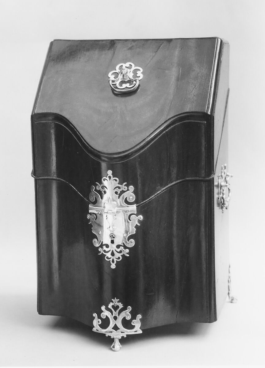 This type of knife case, one of a set of three, was popular in England beginning in the late seventeenth century, and cases like this one, veneered with mahogany and embellished with silver mounts, were popular there in the late eighteenth century. The rare New York attribution of this box is substantiated by the tulip poplar secondary wood and the silver mounts bearing the mark, Fueter, for one of the families of New York silversmiths. Their Rococo manner suggests that the mounts were made by Lewis Fueter or his brother, Daniel. Knife cases were generally sold in pairs, but also like these, in sets of three.
