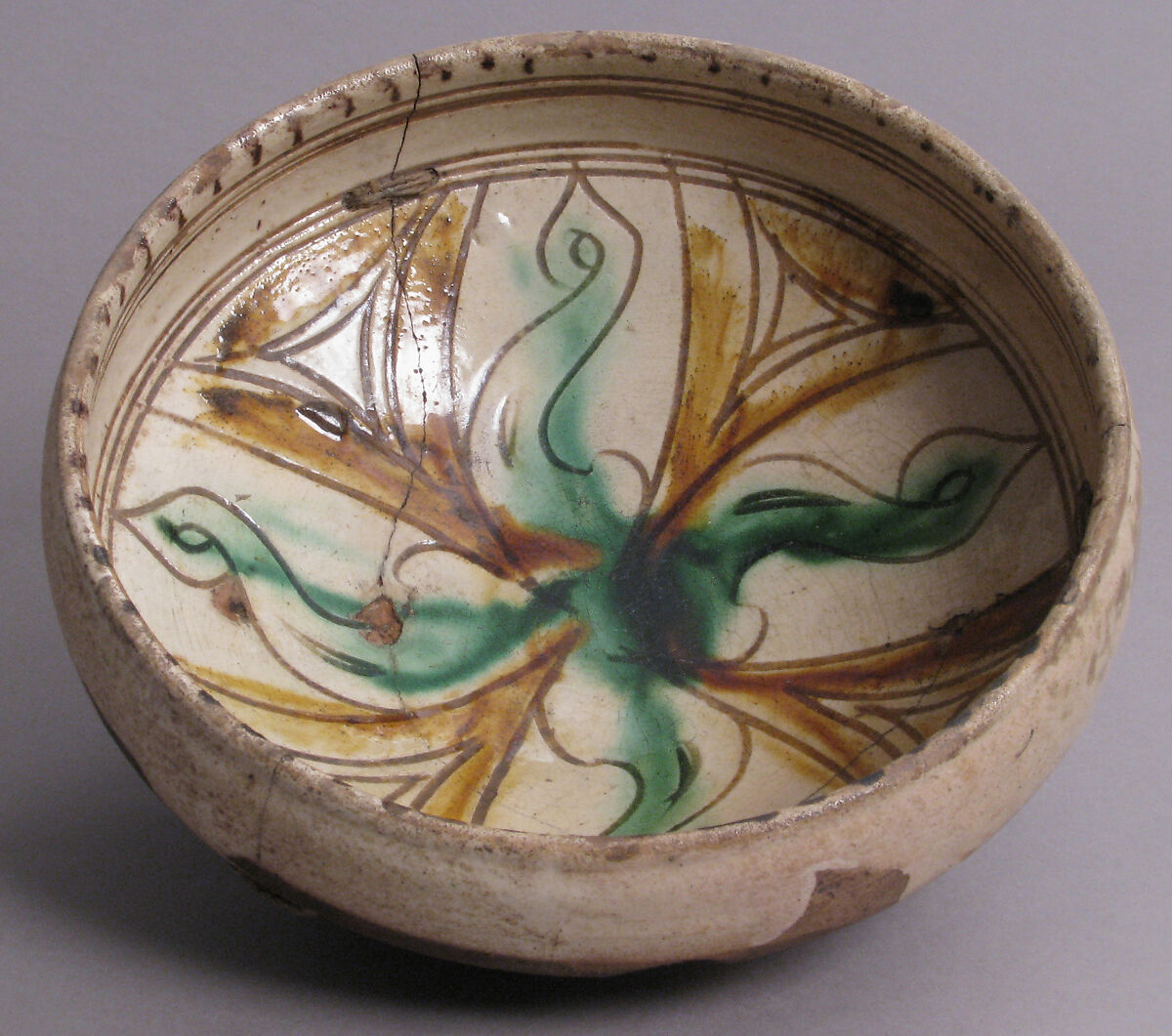 Despite their often bellicose political relationships, ceramic technology and other cultural traditions linked the Byzantine empire and the Islamic world. This bowl was influenced by similar works produced in the early Islamic world. The cords on the bowl were added during restoration.
