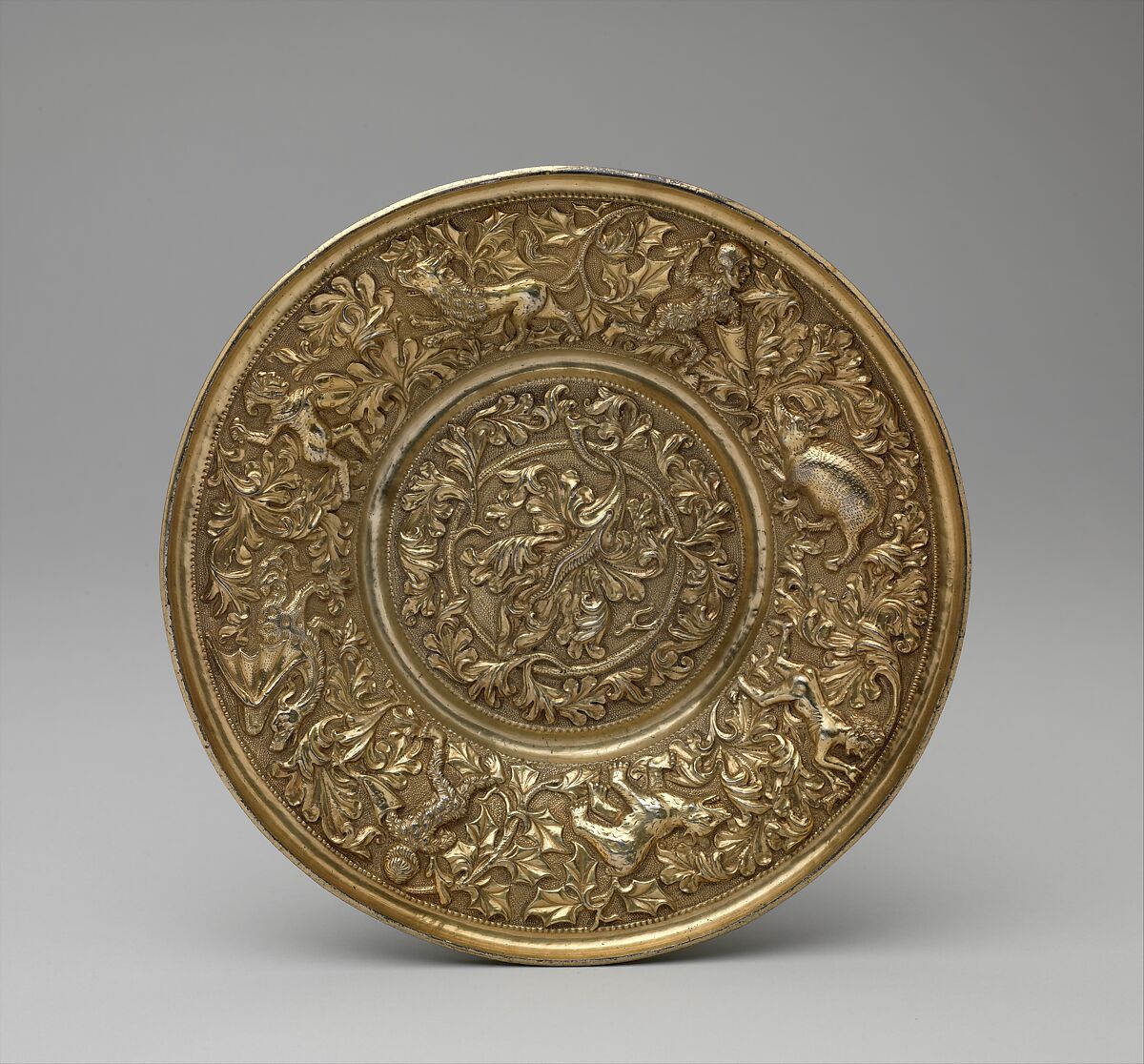 Deeply embossed scrollwork relief fills the center of this small plate, and tiny repoussé figures of late Gothic wild men and animals amid foliage appear in a hunting scene on the rim. The lavish decoration of this plate is characteristic of a group of Portguese plates and vessels of the fifteenth century, and reflect the general tendency of this period of toward abandoning simple motifs in favor of more elaborate and complicated designs. Later Portuguese examples generally depict scenes of a more classical nature such as the history of Troy. Larger dishes of this type were intended to be used as basins made as sets with equally sumptuous ewers, but the small size of this example precludes such a possibility. So small a plate, called a salva in Portuguese, would hardly have been intended for regular service use at the table, although it might, on special occasions, have served as a dish for a few choice pieces of fruit.