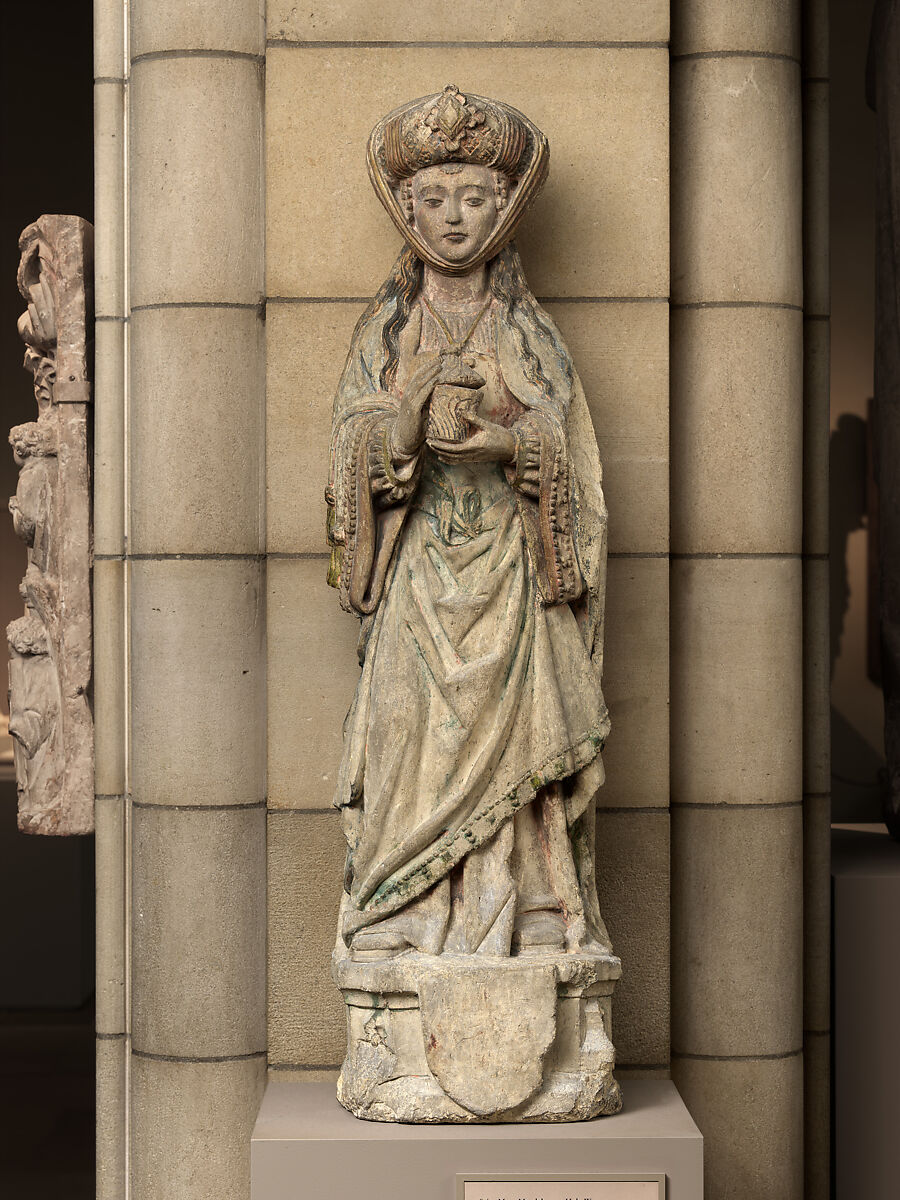 hinted at loose morals. Only the ointment jar, delicately held open, reveals the figure to be Mary Magdalene, known to medieval Christians as a reformed woman who twice anointed Jesus’s feet. Legends held that she renounced her role as a sex worker and the riches derived from it after converting to Christianity. The sculpture juxtaposes the fine clothing of her early life with the prominent cross hanging from her neck as a reminder that even sinners may seek salvation.