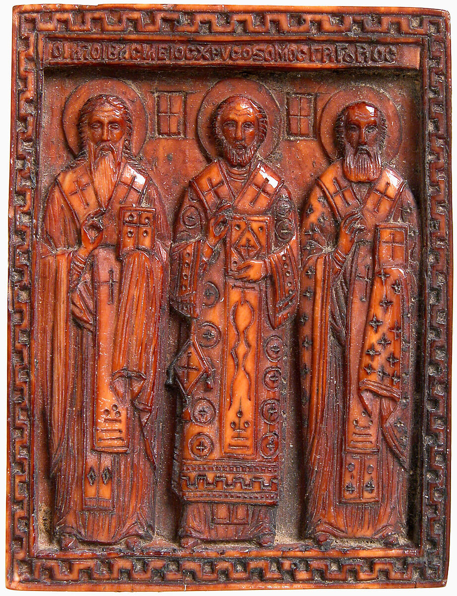 The church fathers identified by inscriptions on this small icon, Saints Basil, John Chrysostom, and Gregory [of Nazianzos], played a critical role in establishing church doctrine during the first centuries of Christianity.