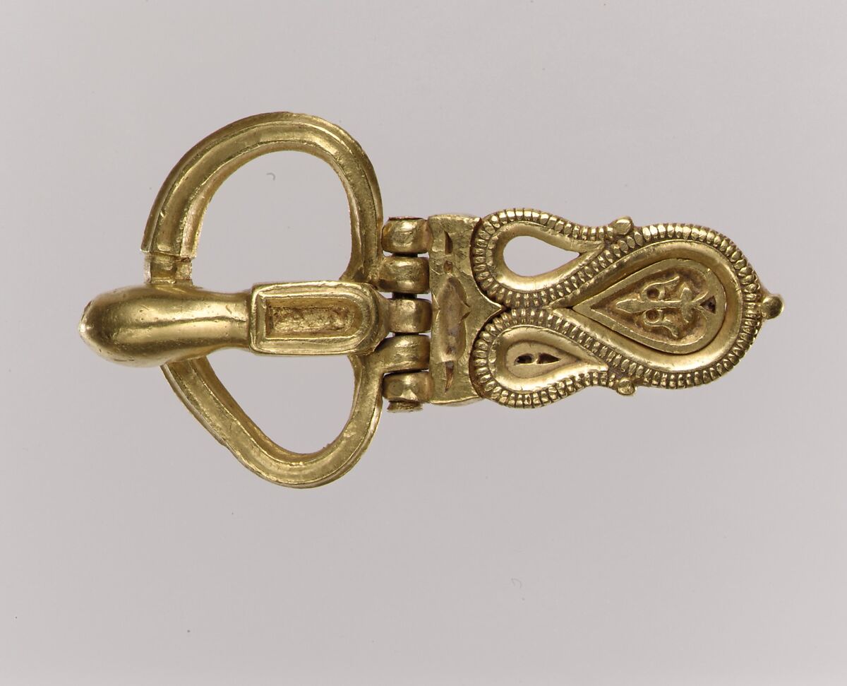 - Medium: Plaque: gold - sheet; wire - beaded; granulation. Tongue: gold - sheet; setting. Loop: gold.
