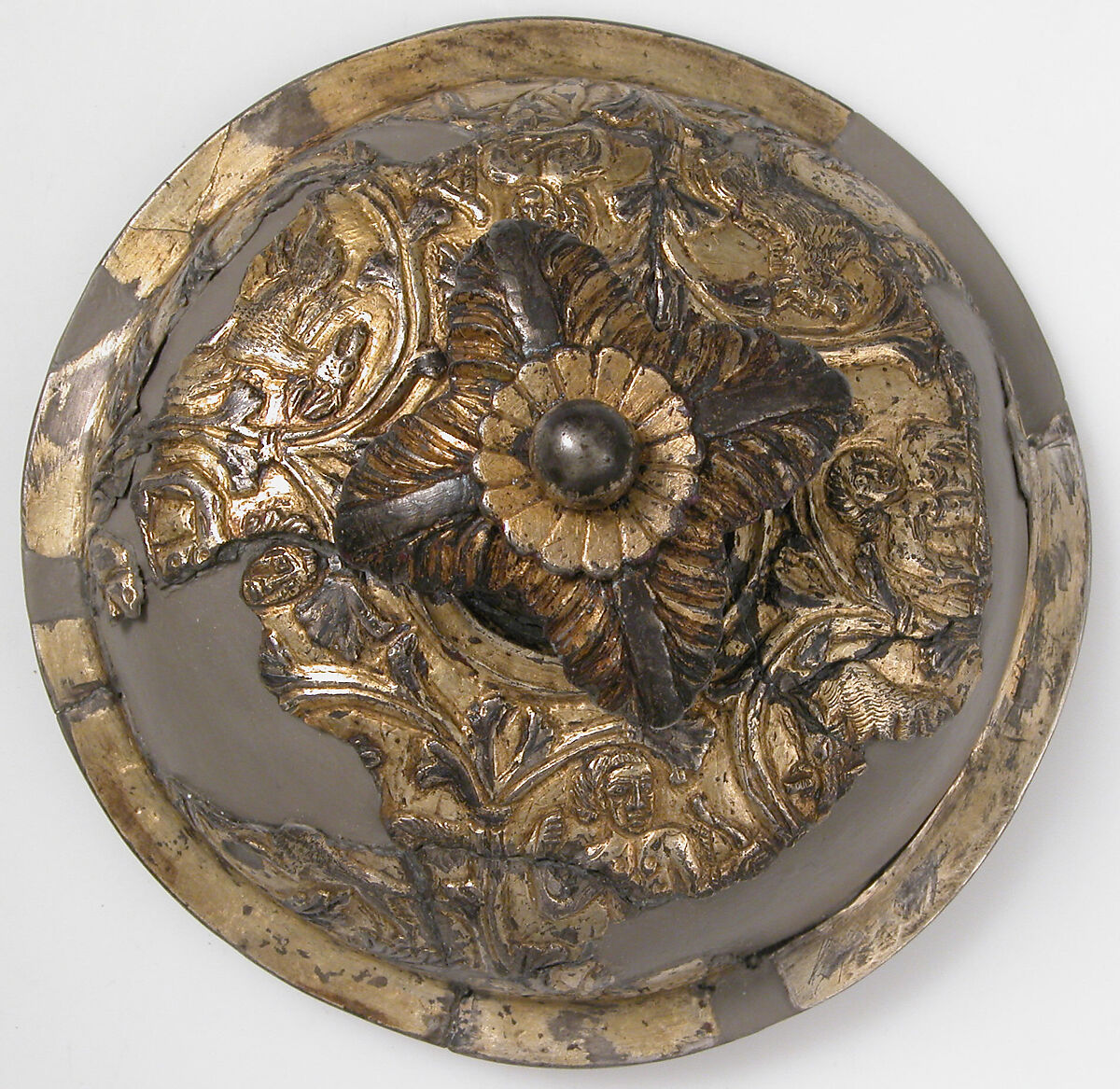 Adorned with hunting scenes surrounded by a scrolling acanthus vine, this restored lid is a rare surviving example of secular goldsmiths’ work from the Carolingian period. Similar subjects are found on contemporary ivory carvings and in illuminated manuscripts.