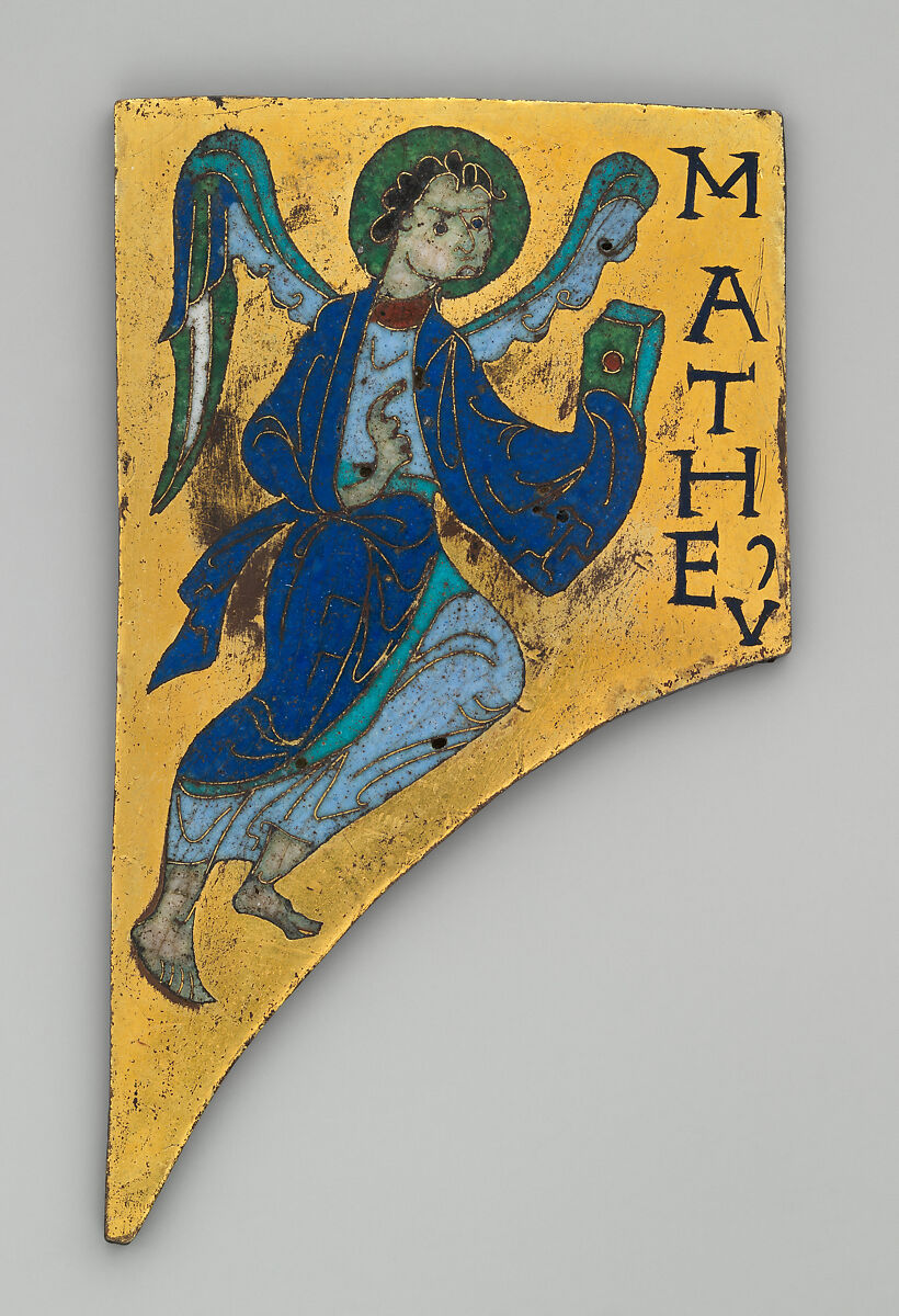 This plaque, part of an ensemble including four plaques with the symbols of the evangelists and a central roundel with the crucifixion, probably from a book cover, can be securely attributed to the celebrated pilgrimage abbey of Saint Foy at Conques, France's richest surviving repository of medieval goldsmith's work. Several of the rare works dispersed from the abbey's treasury in the nineteenth century share with others still in situ a technique, style, and palette uniquely combined during the abbacy of Bégon III in the late eleventh century. For these pieces the monk goldsmiths employed superimposed copper plaques, the lower one to receive the delicate cloisons that define features and drapery, the upper one cut to delineate the silhouettes of the figures and the cross. Hallmarks of the style include the single cloison used to define eyebrows and noses and the thin loop of gold that creates cowlicks. In the Metropolitan's reconstituted ensemble, the same remarkable oxblood color was used for the symbol of Saint Luke and the hair of the image of the Sun ("Sol") above the Crucifixion. Furthermore, scientific analysis has determined that common enamel compositions and the same metallic oxides were used to tint and opacify all five pieces.