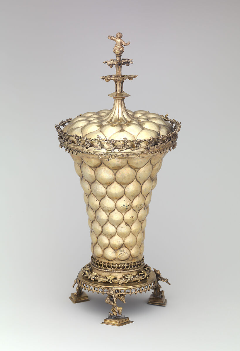 The emblem of the fisherman’s guild—a boat’s rudder and fishing hook crossed—is affixed to the inside of the beaker’s cover. Proud of their trade up and down the Danube, members of the fisherman’s guild embellished their emblem—a boat’s rudder and fishing hook crossed—to the inside of the lid of this festive drinking cup. A few years later, in 1498, they affixed the same motif to the guild house that they owned in the city of Ingolstadt.