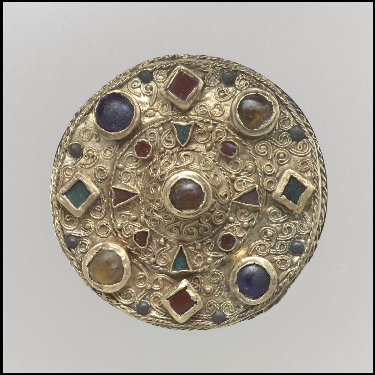 The dress of Frankish women generally consisted of a tunic, cinched by a belt from which hung an array of pendants. A wrap or cloak went over the tunic. Shoes and hosiery, fastened with buckles, covered the legs. Earrings, necklaces, and hairpins completed the ensemble.