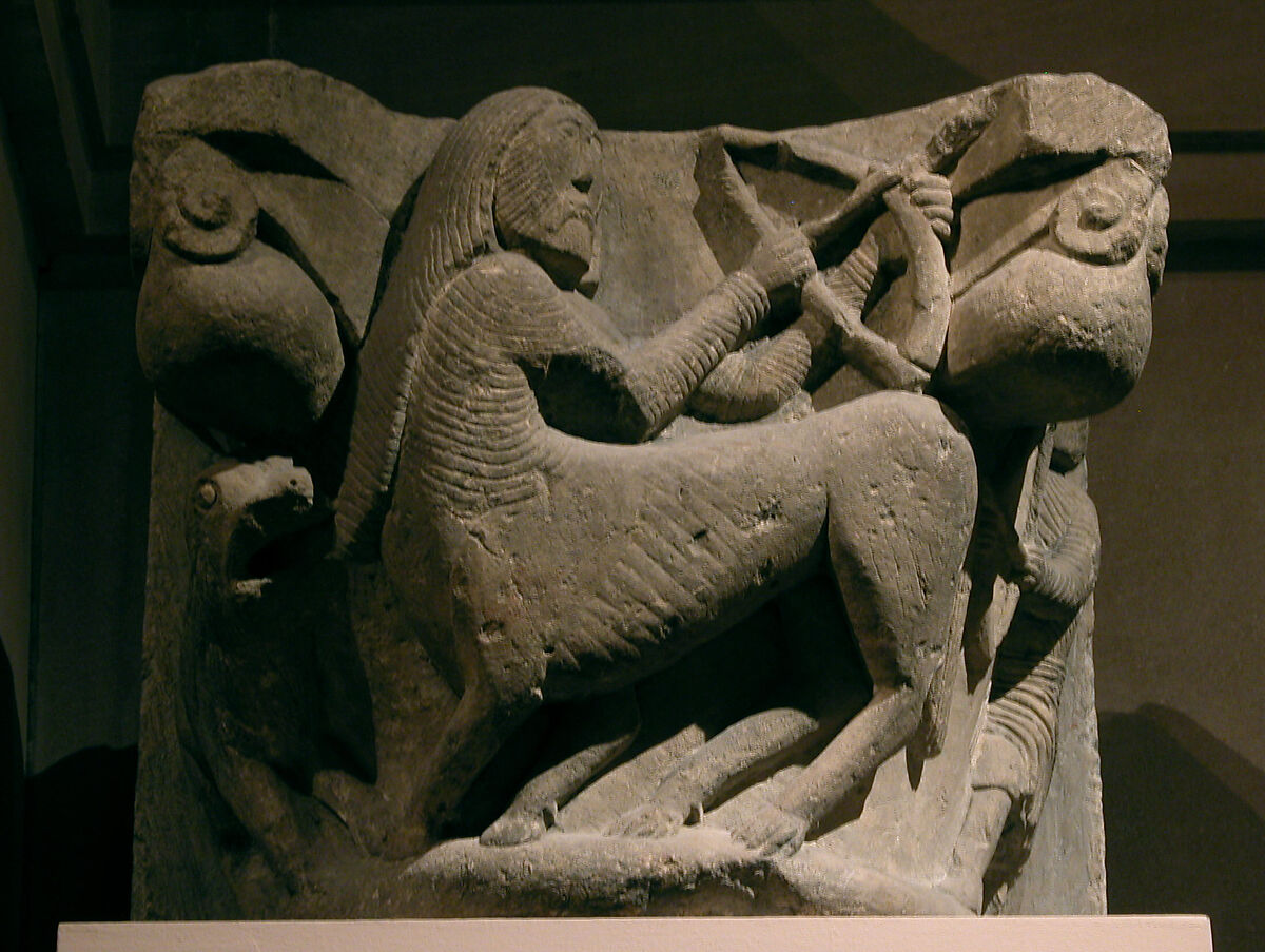 Like the capital to the right, this one depicts a man and animal engaged in combat and in a similar almost abstract manner. Here the centaur engages a man with bow and arrow.