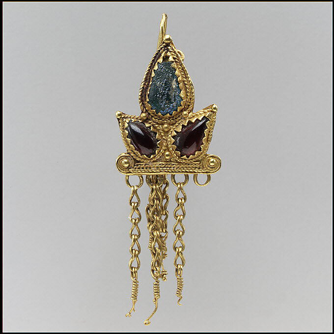 - Medium: Gold, garnets, green glass