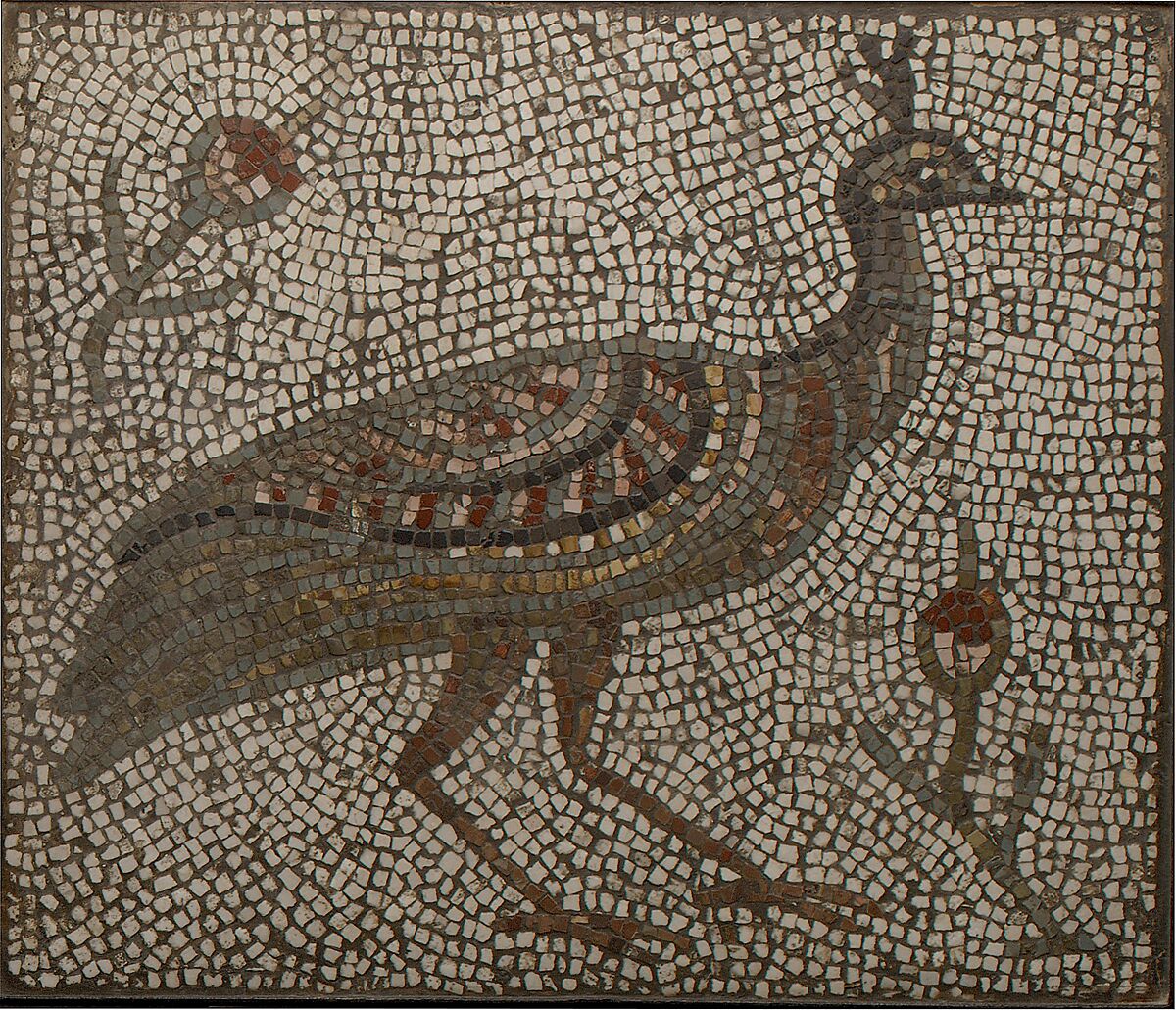 This mosaic, probably part of a much larger floor mosaic, shows a peacock among flowers. The peacock was a popular subject for Roman and Byzantine artists, often used to represent paradise, renewal, and spring. Byzantines might have thought the peacock an appropriate symbol for the season, because its elaborate feathers grew each spring. Associating the peacock with heavenly paradise was an extension of the Byzantine vision of earthly paradise—many wealthy citizens were known to have kept peacocks to roam about the flowers and trees of their gardens.