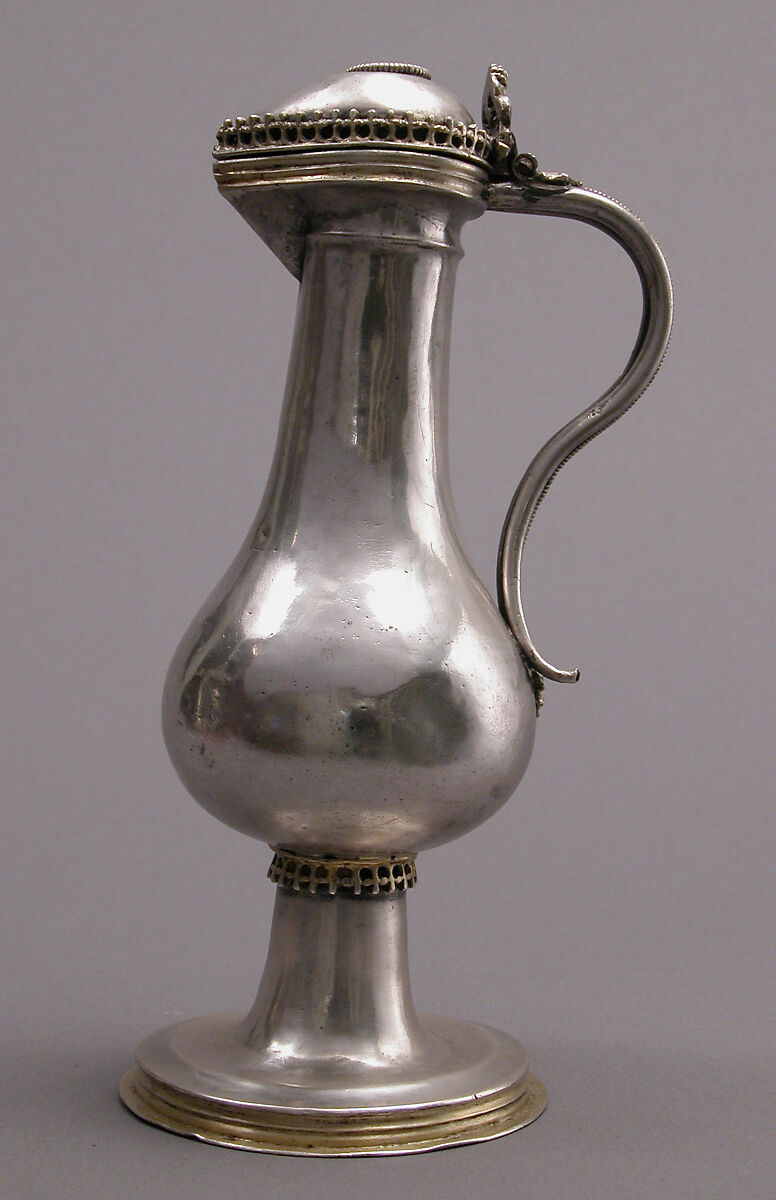 This pair of silver vessels closely resembles the handled silver flagons perched on the shelf in the upper right corner of the nearby painting. Such objects were created for use on the table, where they reflected the high status of their owners. This pair was used in church services. Their diminutive scale reflects the small quantity of wine used in the Mass prior to the Reformation. For the liturgy, such objects were always made in pairs (for wine and water). Since these two liquids were combined in the chalice, cruets were often distinguished by the letters V (vinum) and A (aqua) engraved on the lid.