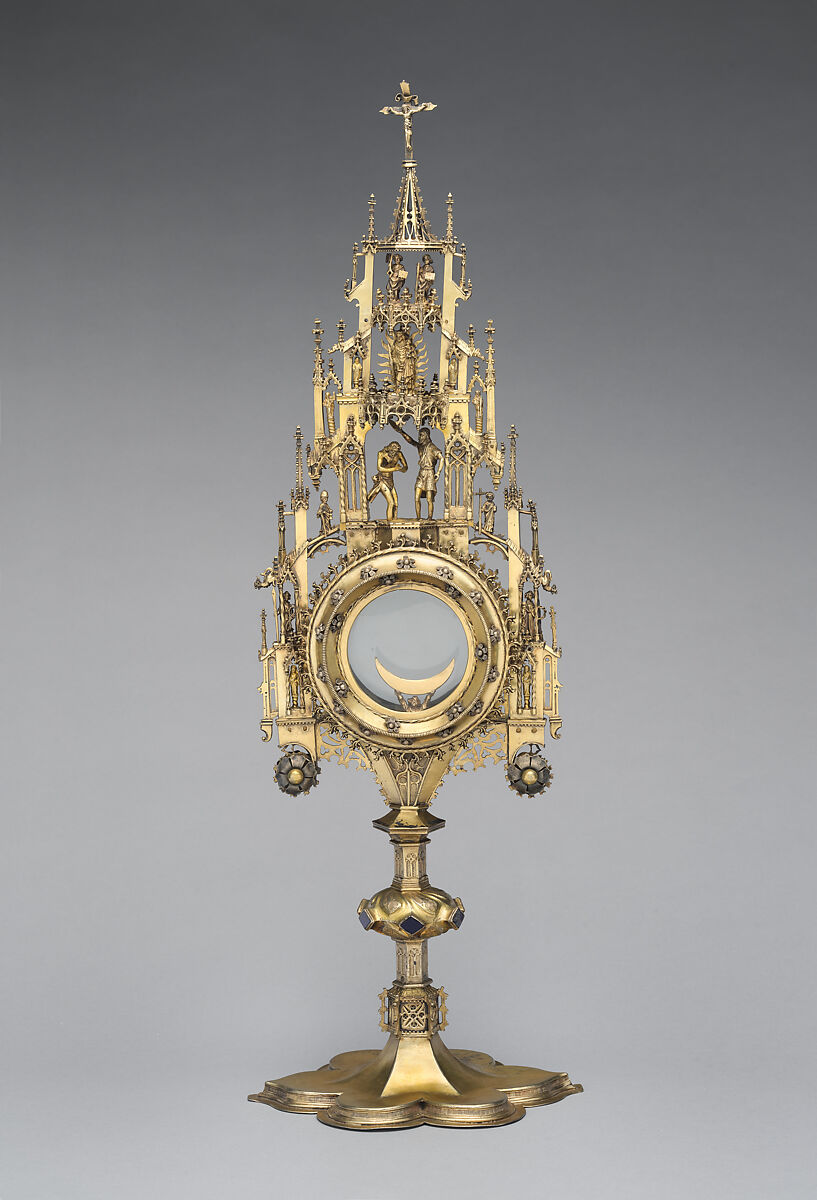 Monstrances were vessels created to display the consecrated Host, the body of Christ. They were first created in response to the Feast of Corpus Christ established in 1263 that enabled the faithful to see and venerate the consecrated Host on a crescent moon-shaped mount.