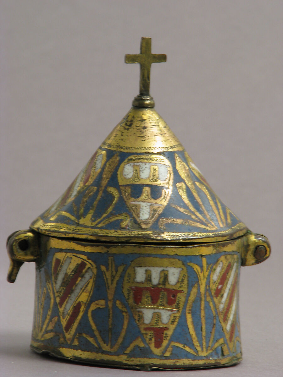 The coats of arms on this pyx are fictive—they are used simply as a decorative element. They may seem a curious choice for an object meant to hold the bread consecrated as Christ’s body during the mass, but the lines between the religious and worldly realms of the Middle Ages were often blurred.