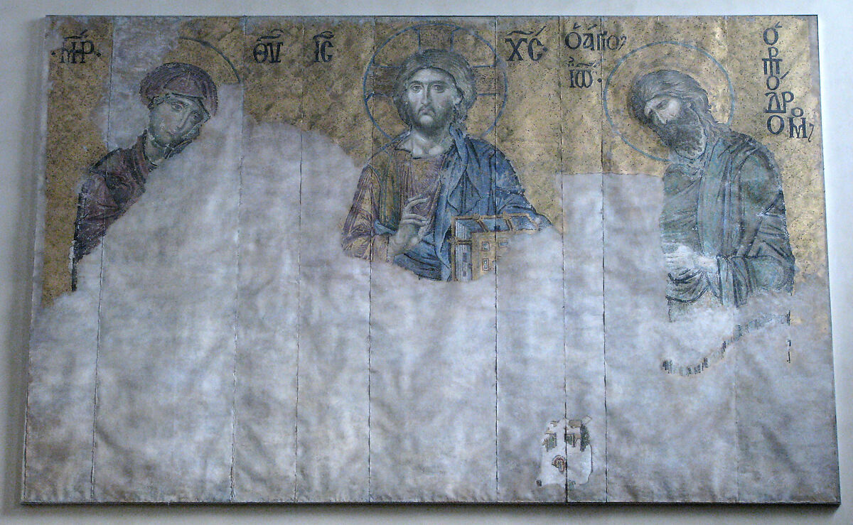 The original mosaic displaying the Deesis (Christ flanked by the Virgin and Saint John the Baptist) was one of the finest works produced in Constantinople, capital of the Byzantine Empire. Concealed for centuries after the fall of the city to the Ottoman Turks in 1453, the mosaic was one of the many in Hagia Sophia restored by the Byzantine Institute of America in the late 1930s. The newly revealed mosaics were the focus of an exhibition at the Museum in 1944, when this work, the only full-scale, exact, and authorized copy of the Deesis mosaic, was featured.