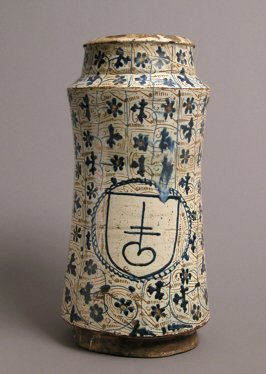 The albarello, a vessel introduced to Spain from the Near East through the spice trade, was rapidly adopted by Valencian potters and produced in great numbers. Although the profiles of the fifteenth-century examples vary, they are all typically cylindrical, slightly concave in the center, with a sloped shoulder, a collar with a narrow-lipped mouth, and a similarly sloped bottom leading to a beveled edge base. Although earthenware covers may have been used, contemporary panel paintings illustrate the more common technique of sealing the mouth with a piece of parchment tied with a string. Generally, albarellos were labeled, not in the design, but by affixing identifying marks or inscriptions on parchment to the container. In rare cases, such as this albarello, markings were painted on and glazed. In this example, the symbol within the shield identifies the contents as a type of powder.