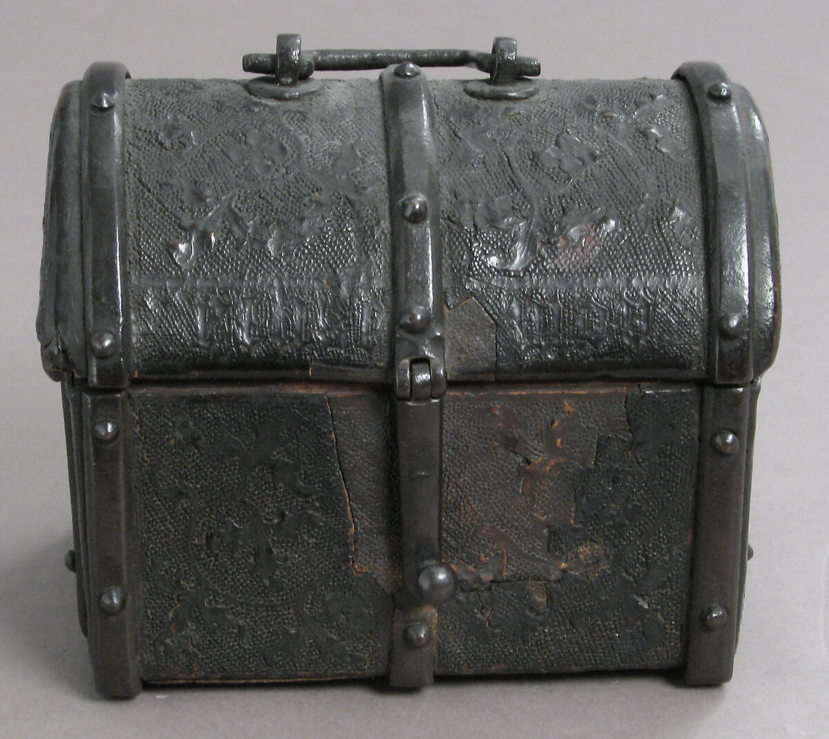 - Medium: Cuir bouilli (tooled leather), iron fittings, wood core, parchment lining