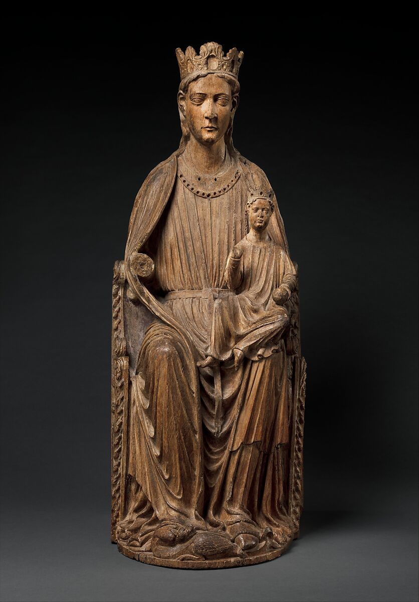 Crowned as the Queen of Heaven, Mary is seated on a richly ornamented throne, while the infant Jesus holds an orb or apple and blesses. Mary also tramples a dragon in triumph—a visual reference to the Book of Genesis (3:15), in which God declares to the serpent, “I will put enmity between thee and the woman.” The fluid drapery style is a hallmark of northern sculpture about 1200.