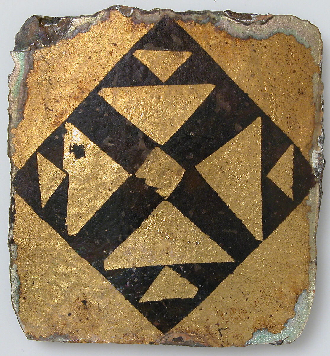 This lustrous tile is made of dark purple glass overlaid with gold foil and sealed again with clear glass. The gold foil triangles form a cross pattern. Such tiles may have been used to decorate walls or other objects in a Syrian church.