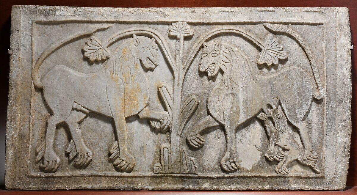 The marble for this relief panel probably came from a Roman sarcophagus. The slab was recarved and reused during the early Middle Ages for a church in Nola, probably to be used as a choir screen. Lions are often used as symbols for Christ in Italy during this period, but the depiction of a family with a male, a female, and suckling cub is unique.