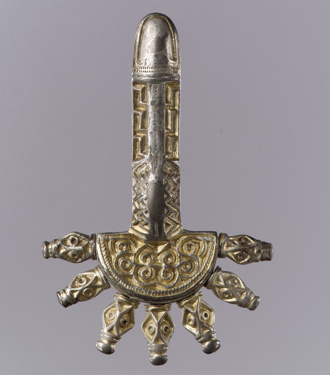 The bow brooch was a component of many Germanic women’s dress. In Frankish territory brooches were generally worn in pairs, as decorative elements on a strap hanging from the belt. The bow refers to the bend or curve that links two terminals