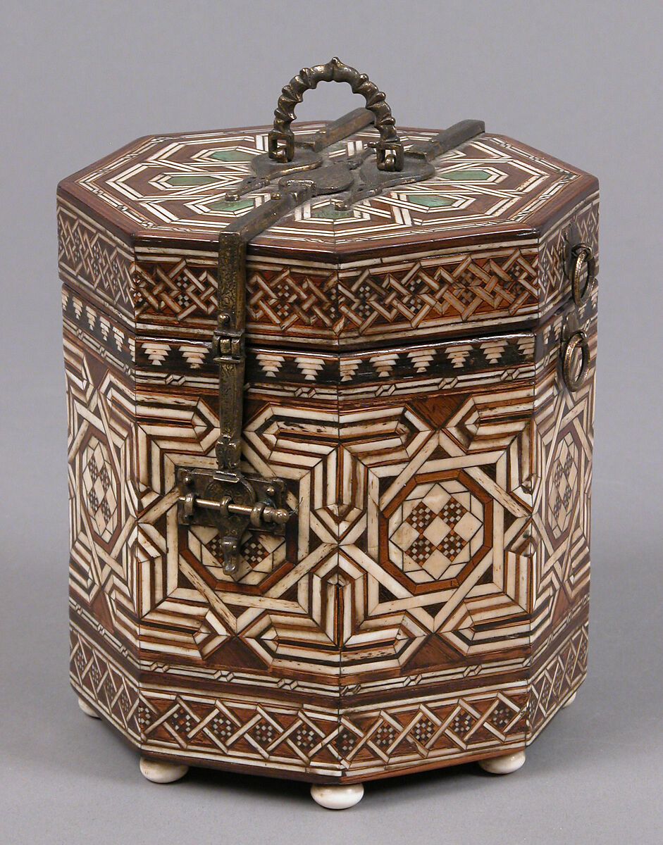 One of the many techniques mastered by woodworkers in al-Andalus was marquetry – fitting small pieces of different materials together, jigsaw-like, to create a pattern. This box incorporates thin slices of different species of wood, some stained green, together with ivory or bone. Its octagonal shape, complemented by 8-pointed stars on the lid and base, is echoed in the central pattern on each of the sides. The band of linked, rotated squares on the sides of the lid strongly resembles a marquetry pattern found on the late-12th or early-13th century minbar of the Qasba Mosque in Marrakech, perhaps made by Andalusi craftsmen, suggesting a similar date for this box.