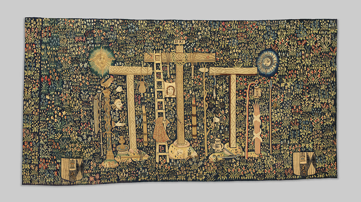 The crosses on which Jesus and the two thieves were executed appear, improbably, against a rich backdrop of flowers. Around the crosses are objects linked to the suffering and death of Jesus—or Instruments of the Passion—including the scourges used to whip him, the crown of thorns placed mockingly on his head, the cloth with which Veronica wiped his face, and the nails that affixed him to the cross. Judging from its subject and dimensions, this hanging was used on a church altar. The coats of arms at lower left and right are those of the dukes of Segorbe; the textile was likely commissioned by Enrique II of Aragon (duke of Villena and Segorbe in 1472–died 1522) or his son Alfonso.