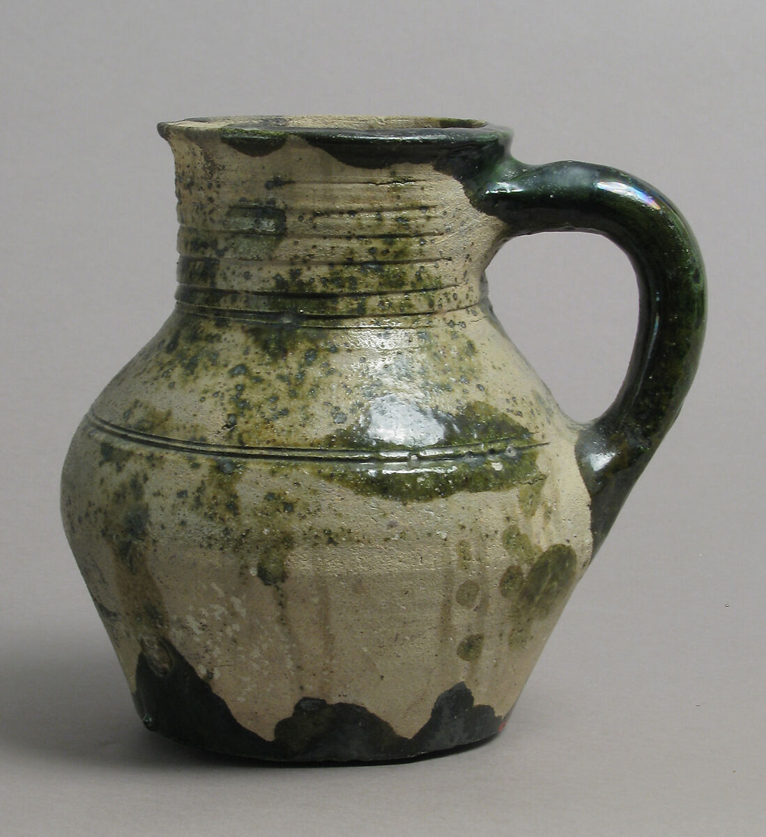 Vessels such as this one, produced during the first half of the sixteenth century and generally referred to as Tudor jugs, were decorated with bands incised by a stylus on the wet clay while the jug was still spinning on the potter’s wheel. The vessel was then fired and given a bright green glaze. These jugs were made not only for pouring but were apparently used for drinking as well. As they resemble certain types of Rhenish stoneware vessels, it is possible that their style was influenced by German or Netherlandish immigrant potters working in Surrey, the probable site of their manufacture.