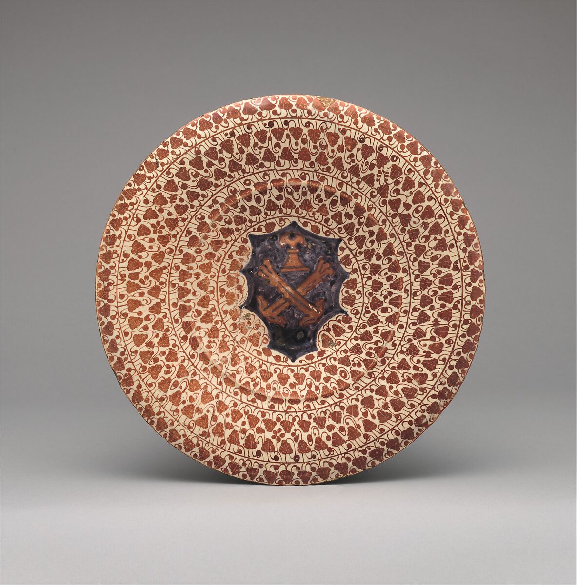 This plate is emblazoned with the coat of arms of the Morelli family of Florence, and must have belonged to a large table service. This small plate, because of its size, was probably used primarily for eating. Examples of matching services have only rarely survived, although documents indicate great numbers were made for both the domestic and the export markets. In a receipt dated 1454, the widow of Don Pedro Buyl, overlord of the Manises lusterware factories, received payment of 6000 gueldos (roughly equivalent to $360,000 in 2016) as a tithe on the potters’ goods destined for the export market. These wares leaving Grao, the port of Valencia, destined for Mediterranean markets, generally were transported by ships of Mallorcan registry. For this reason, lusterware, and later all glazed earthenware, became known as majolica. The ivy pattern rendered completely in copper luster became an increasingly popular decorative motif toward the end of the century as potters more literally imitated the surface sheen of precious metalwork.