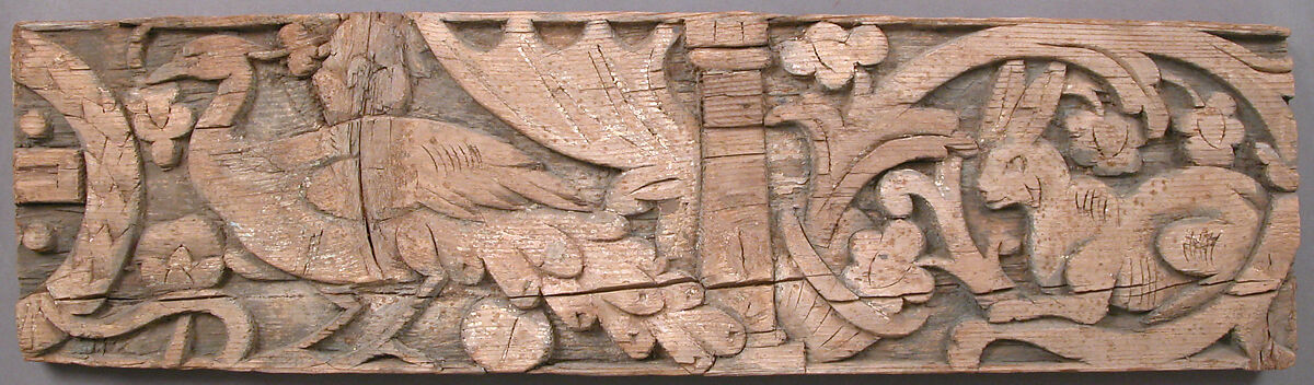 A lion and leopard sprint toward the center of this wood lintel, while other animals sit peacefully. Peacocks of paradise guard a gemmed cross between billowing curtains, draped and held behind two columns. A continuous, decorative stem of vines, flowers, and bunches of grapes encircle the animals in six medallions, creating a motif known as rinceau. The original bright blues, pinks, and greens would have enlivened the decoration of the lintel. The artist merged classical motifs that would typically represent prosperity with Christian themes, possibly illustrating a biblical passage (Isaiah 11:6). During the Late Antique period, Christians aspired to a good life.
