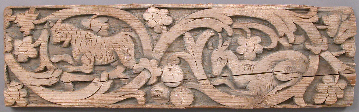A lion and leopard sprint toward the center of this wood lintel, while other animals sit peacefully. Peacocks of paradise guard a gemmed cross between billowing curtains, draped and held behind two columns. A continuous, decorative stem of vines, flowers, and bunches of grapes encircle the animals in six medallions, creating a motif known as rinceau. The original bright blues, pinks, and greens would have enlivened the decoration of the lintel. The artist merged classical motifs that would typically represent prosperity with Christian themes, possibly illustrating a biblical passage (Isaiah 11:6). During the Late Antique period, Christians aspired to a good life.