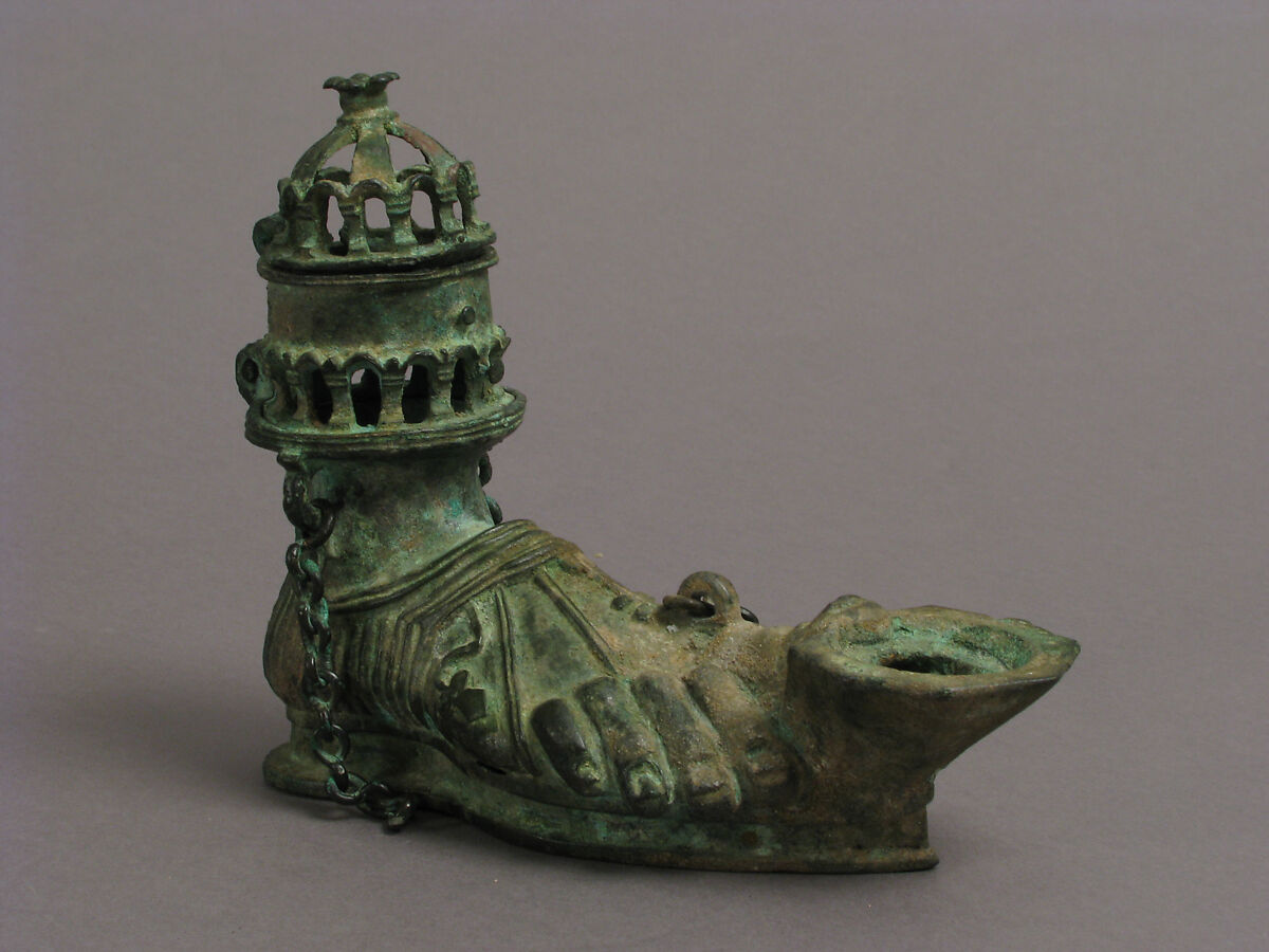One of the classical protective images adapted by Christians was the foot, a symbol of good health and healing. These lamps were lit by an oil-soaked wick, inserted through the hole beside the foot’s big toe.
