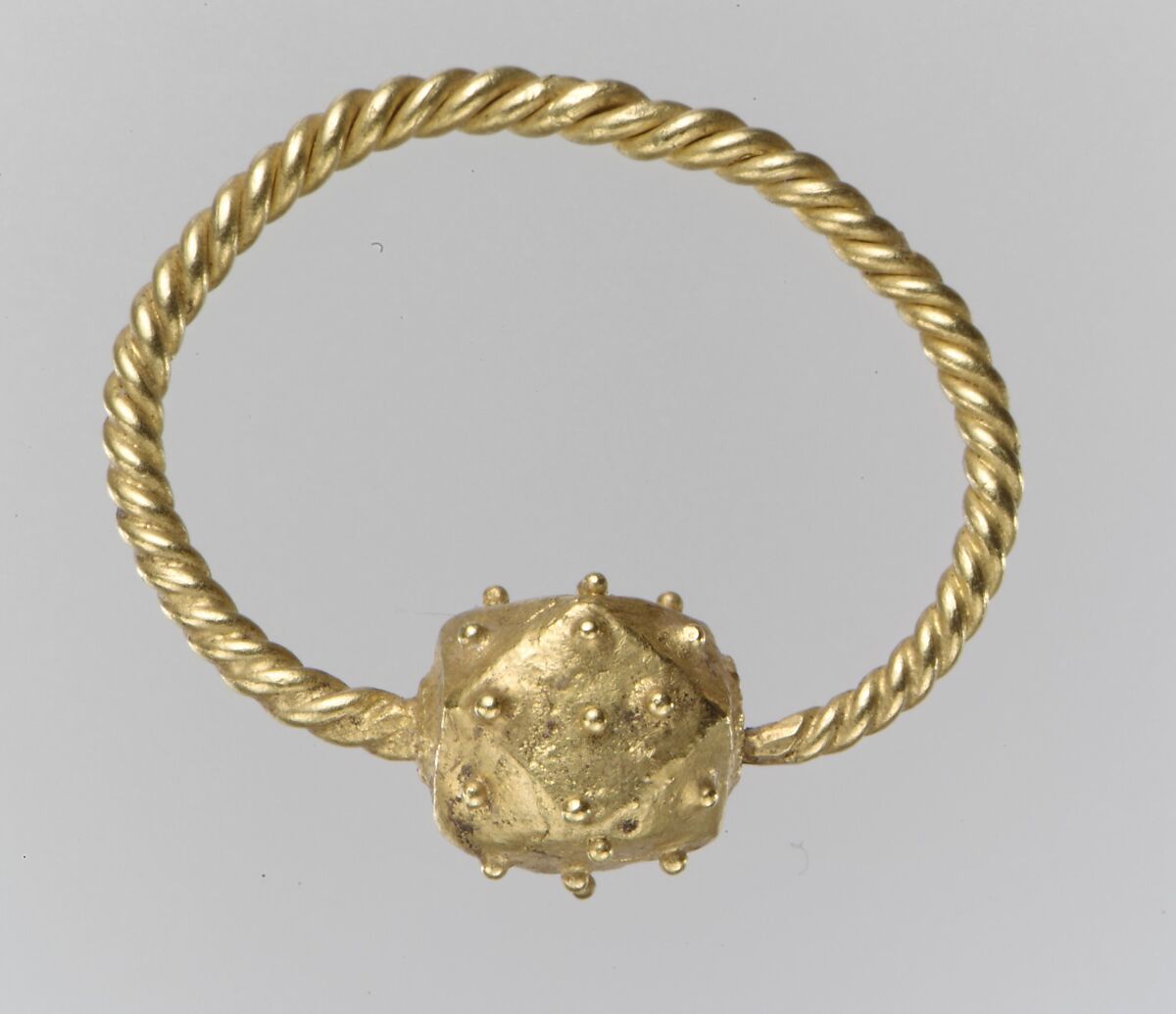 Hoop earrings with polyhedral beads, derived from Late Roman jewelry, were adopted by eastern Germanic women in the fifth century. The distinctive beads, which serve as terminals for the hoops, generally have fourteen sides, eight of which are triangular and six diamond-shaped. Versions have been found made of silver and gold; the polyhedral terminals might be composed of simple undecorated planes or inlaid with semiprecious stones or glass. The Museum's pair, with granulated ornament and a hoop made of two twisted wires, represents a sophisticated and delicate example of the goldsmith's art.