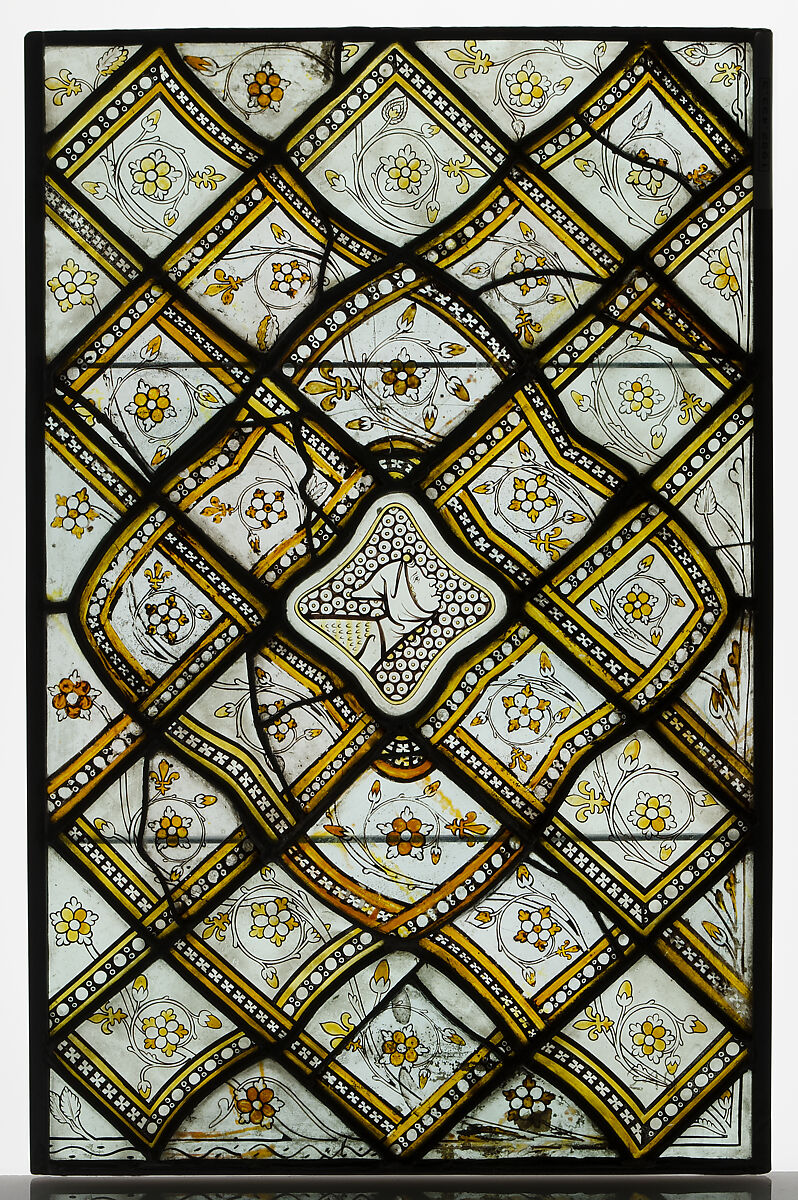 Traditionally thought to have come from the Cathedral of Notre-Dame in Paris, this grisaille panel (one of a pair, see acc. no. 1982.433.4) is now attributed to the Chapel of Saint-Louis at the royal abbey of Saint-Denis. Its distinctive features, the inclusion of the small fleurs-de-lis, which sprout, budlike, from the stems of the foliage, is unique to this panel and to four other related examples—a detail that may well indicate that the glass was created for a royal foundation. The most likely candidate is Saint-Denis, the royal necropolis, where a nave chapel dedicated to Louis IX—who was canonized as Saint Louis in 1297—was completed by 1324. The rebuilding of the abbey church began shortly after Louis ascended to the throne and continued throughout most of his reign (1226–70).